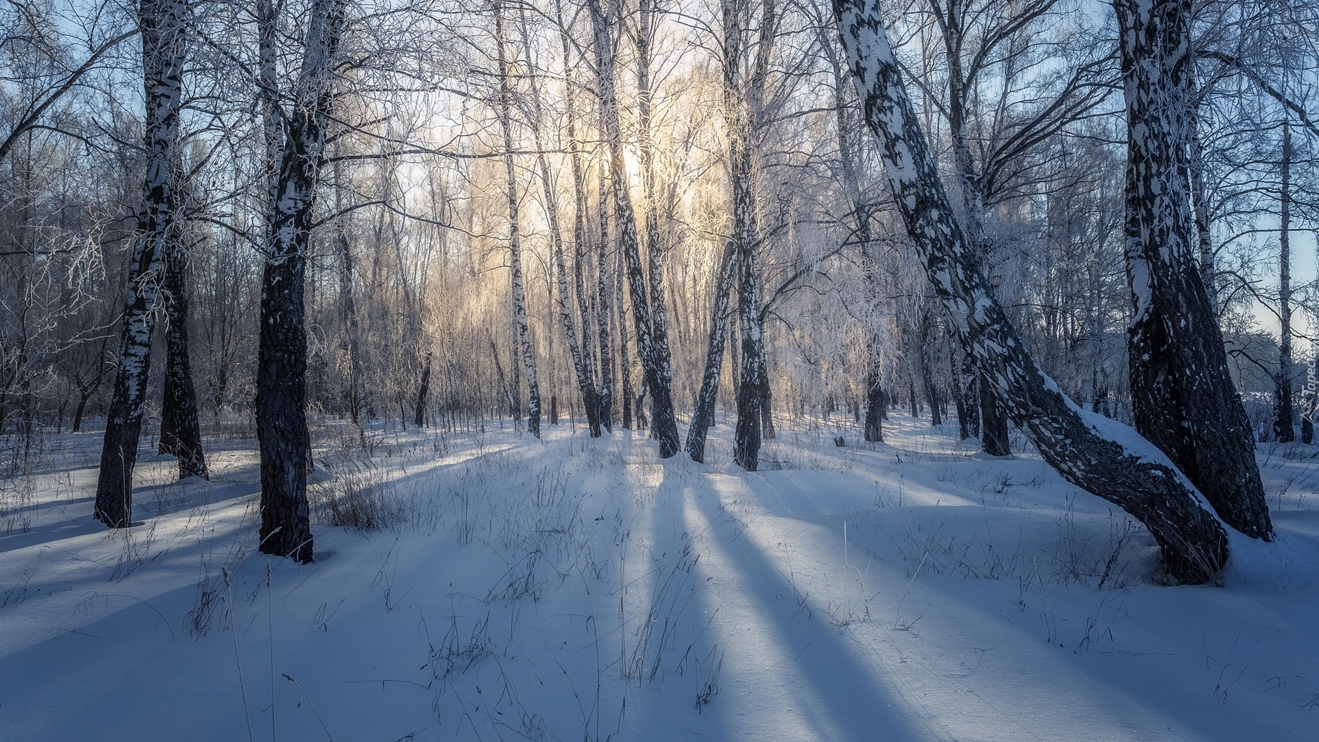 Edytor tapety: Promienie słońca wpadające do lasu zimową porą