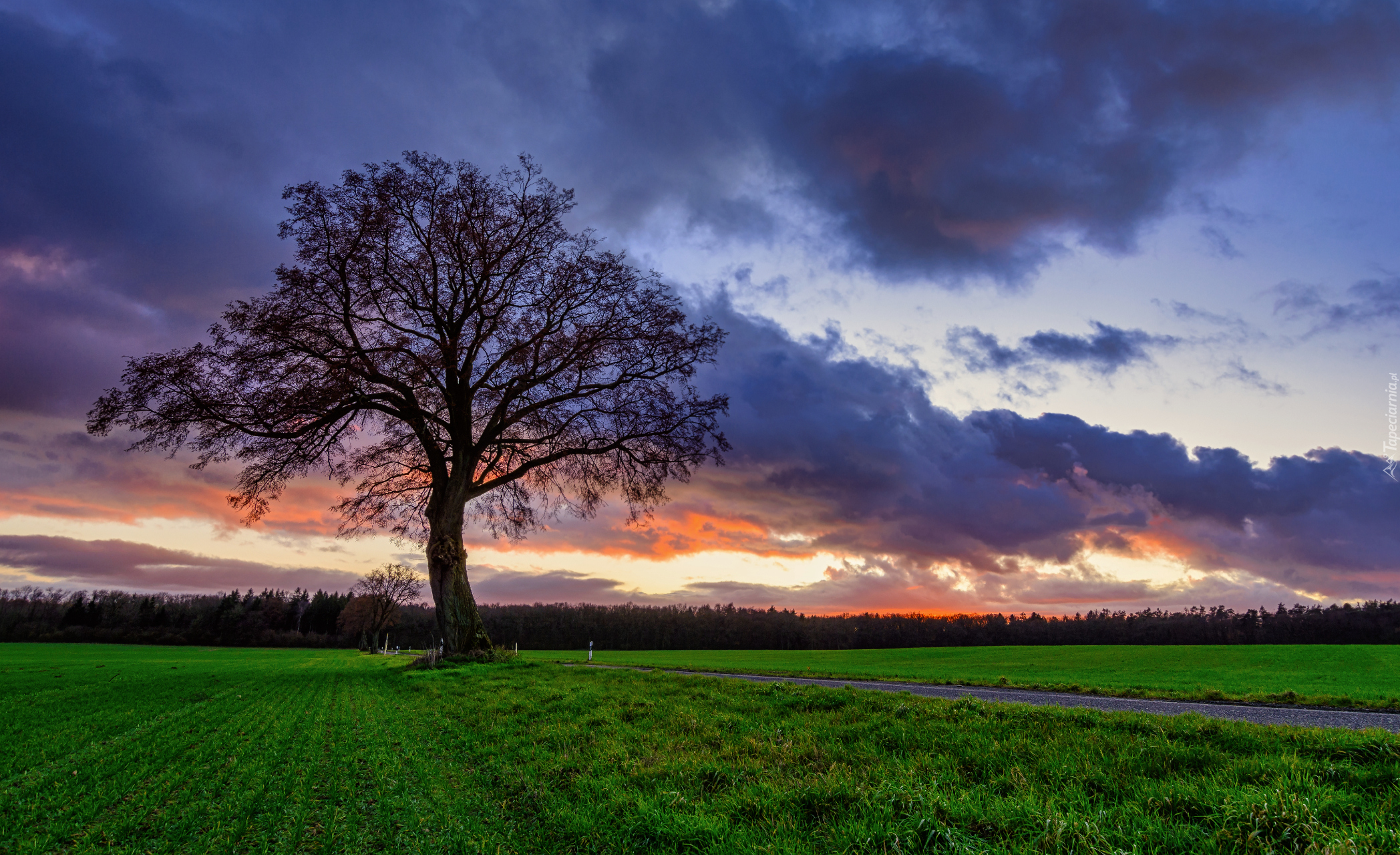 Edytor tapety: Drzewo przy drodze na tle pochmurnego nieba