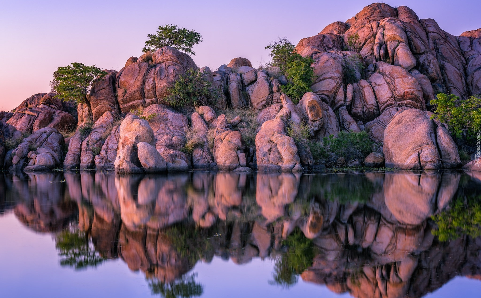 Edytor tapety: Odbicie drzew na skałach w jeziorze