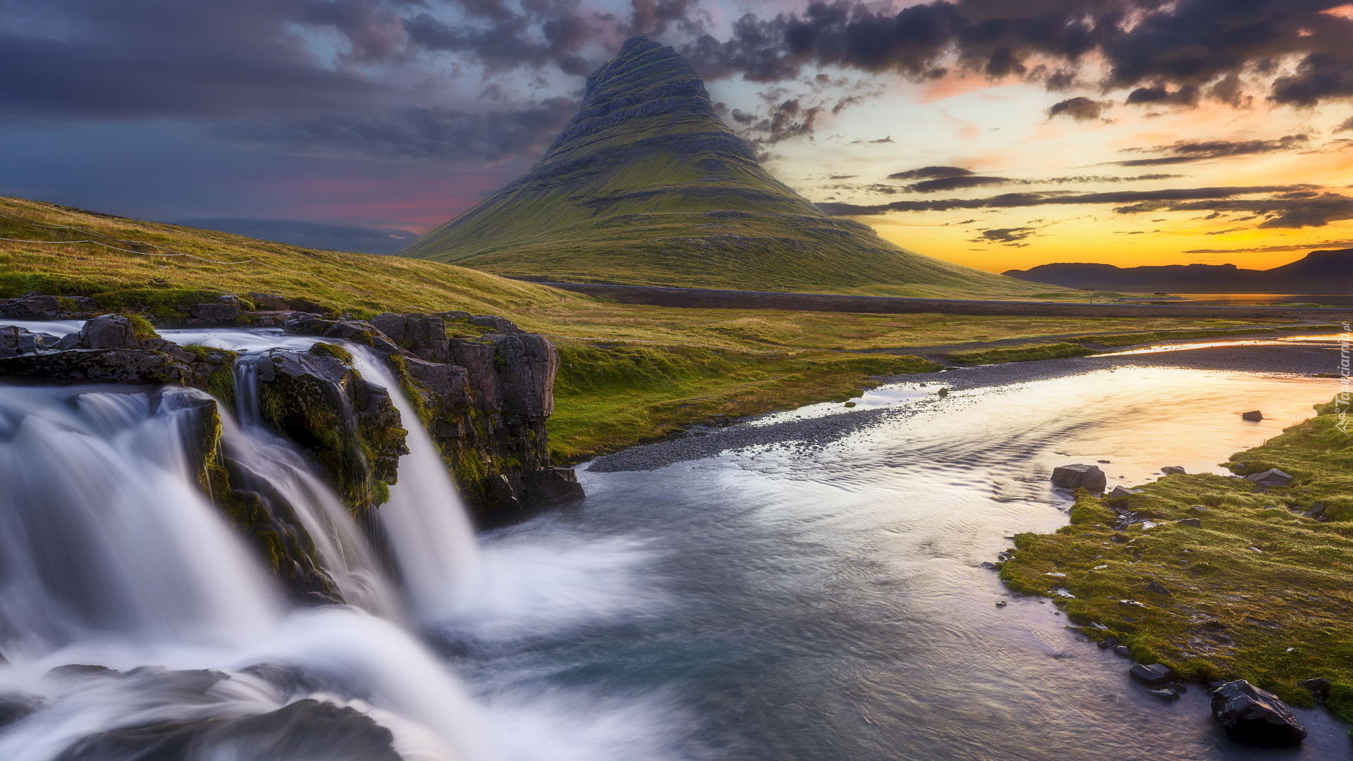 Edytor tapety: Góra Kirkjufell i wodospad Kirkjufellsfoss na półwyspie Snaefellsnes