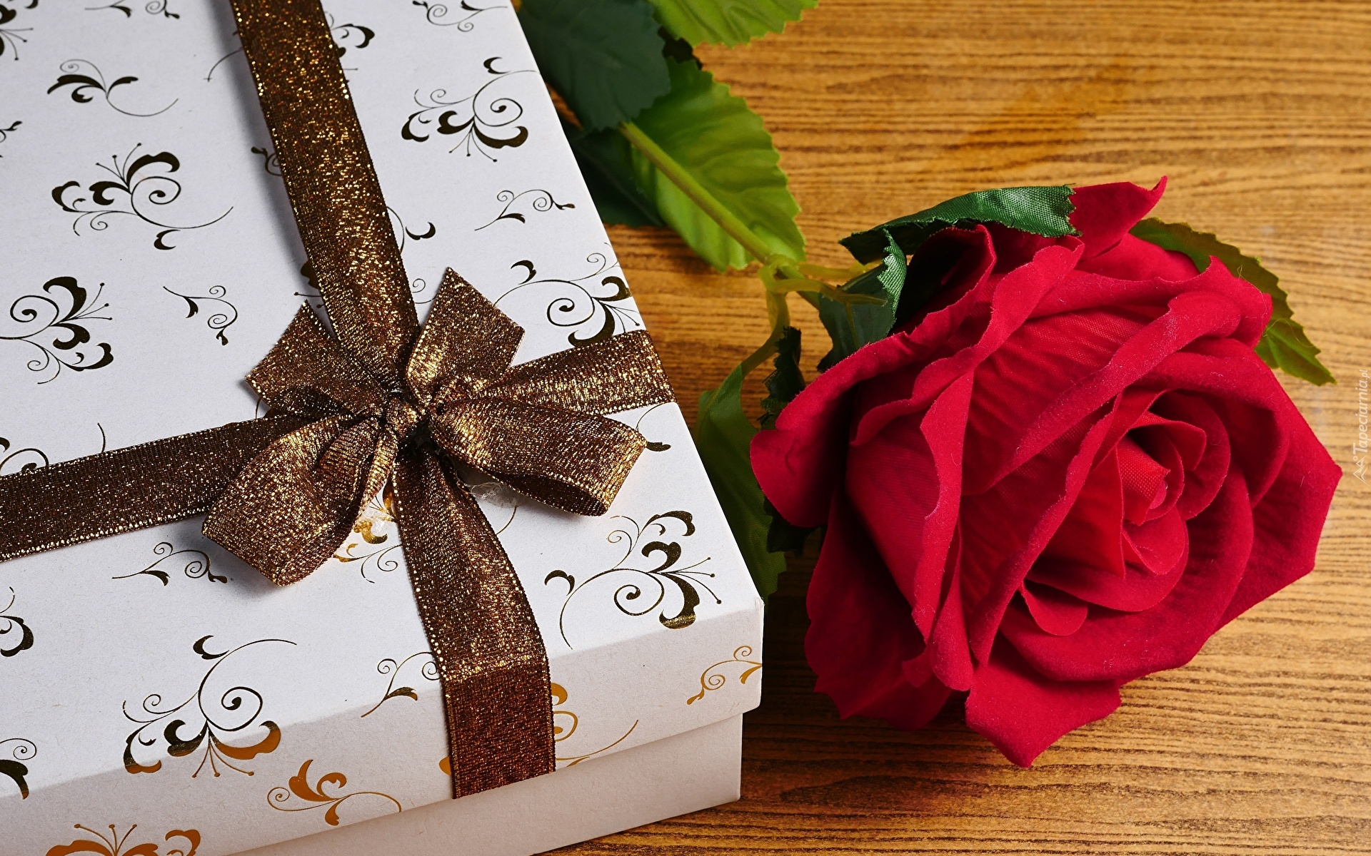 Edytor tapety: Czerwona róża obok prezentu na deskach