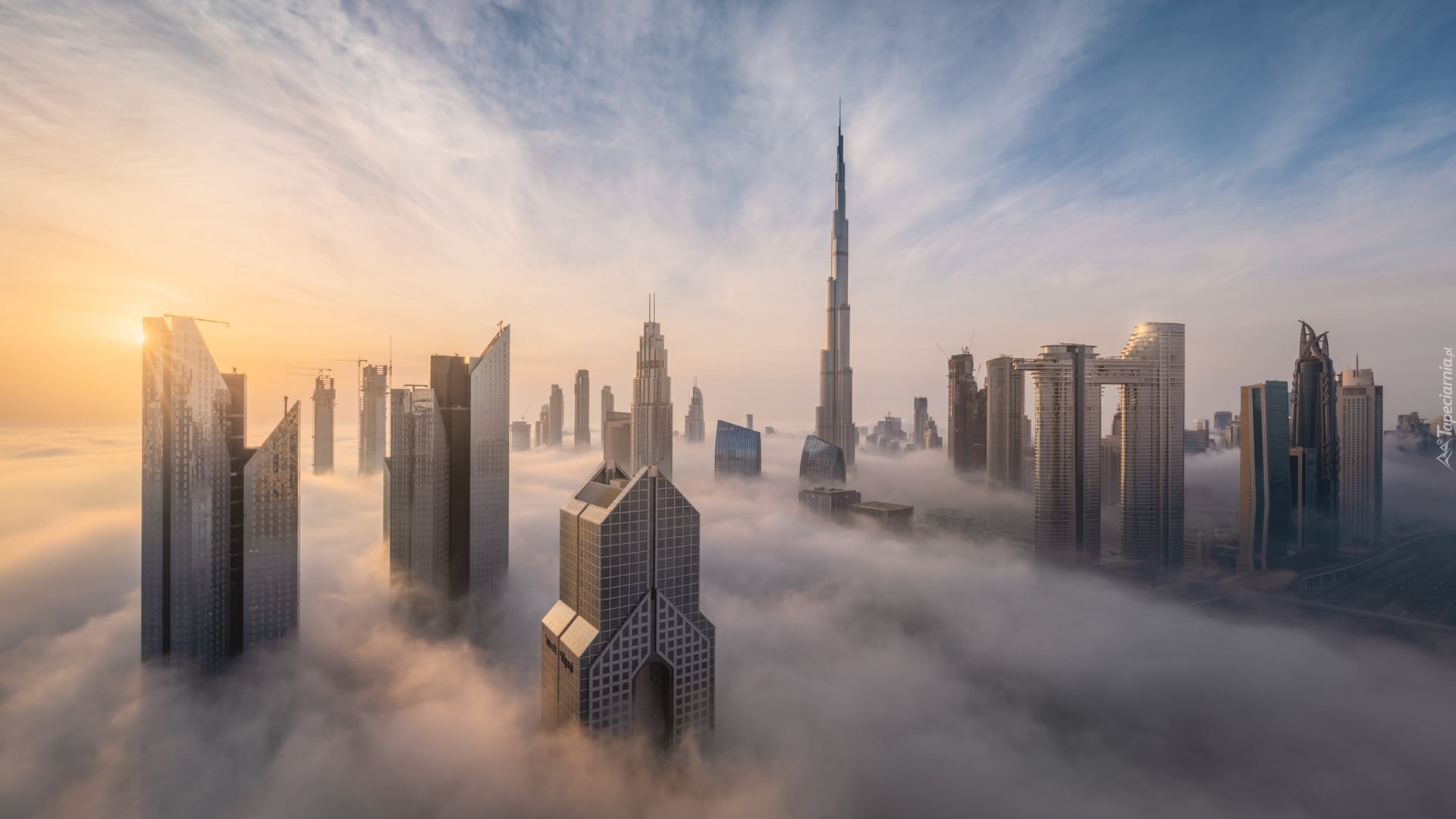 Edytor tapety: Wieżowce Dubaju w gęstej mgle o wschodzie słońca