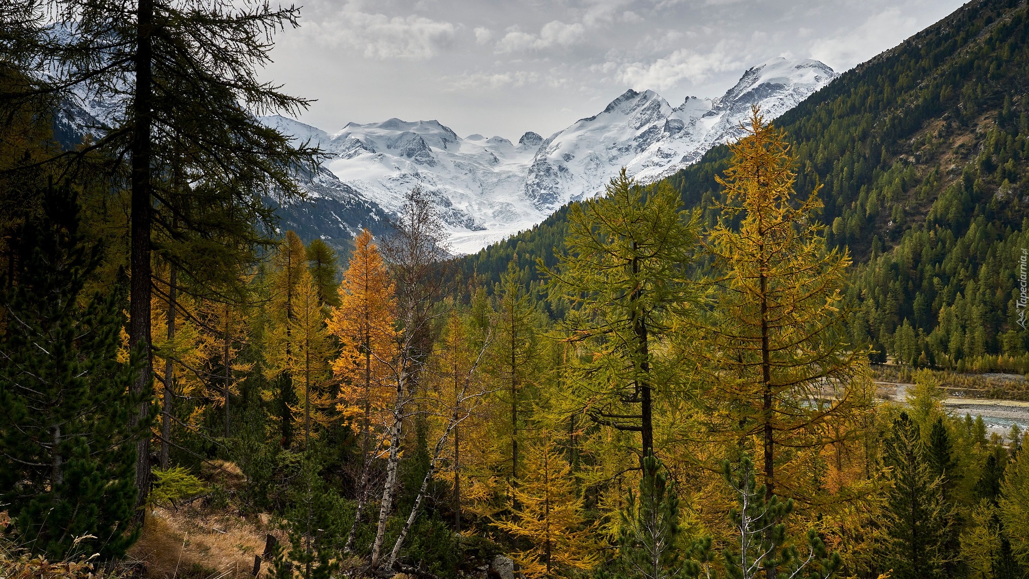 Edytor tapety: Widok spoza drzew na ośnieżone szczyty