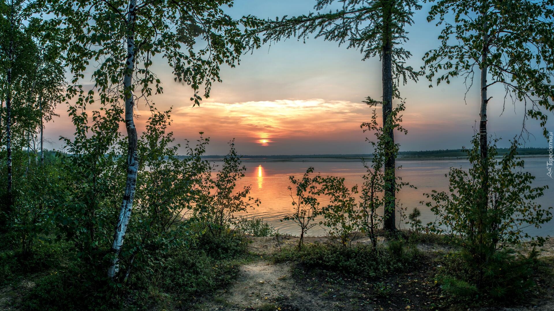 Edytor tapety: Młode drzewka nad brzegiem jeziora
