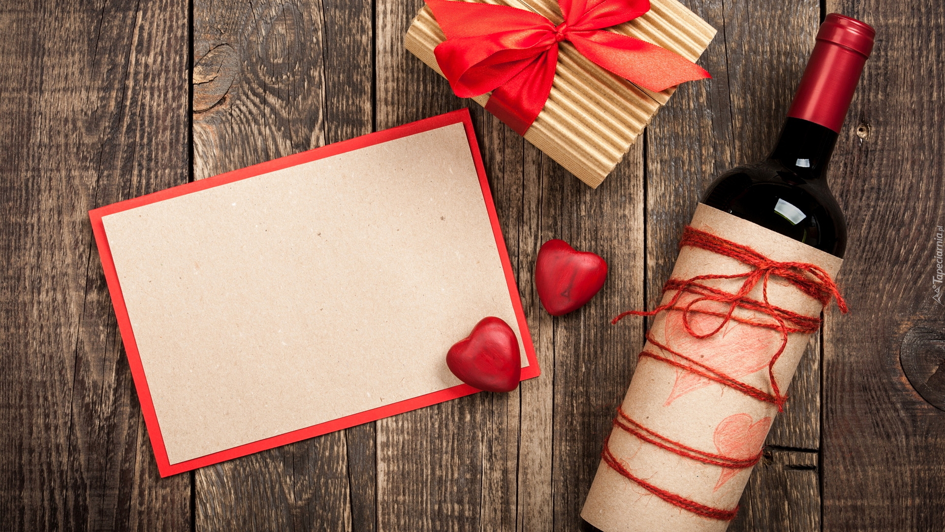 Edytor tapety: Butelka wina obok prezentu i kartki na deskach