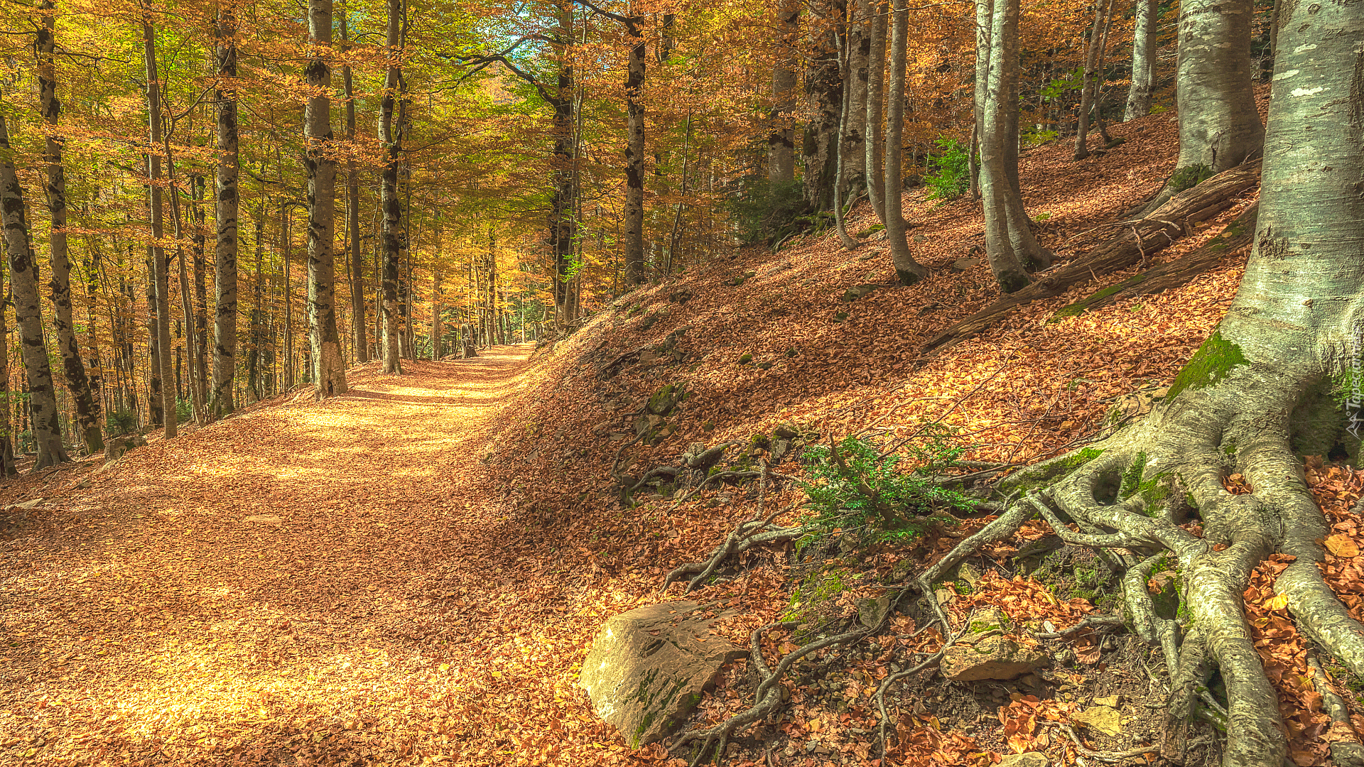 Edytor tapety: Zasypana liśćmi droga w jesiennym lesie