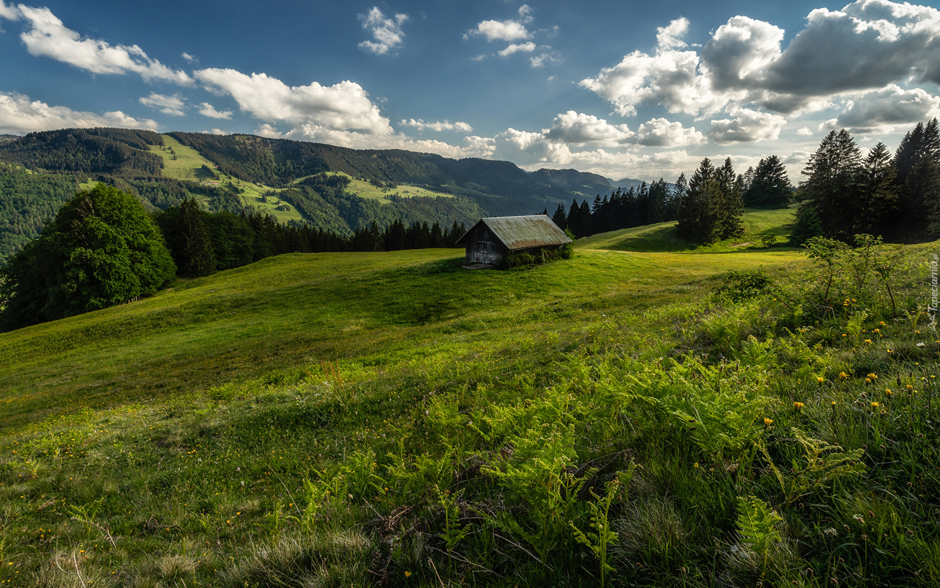 Edytor tapety: Szopa na zielonej łące na wzgórzu