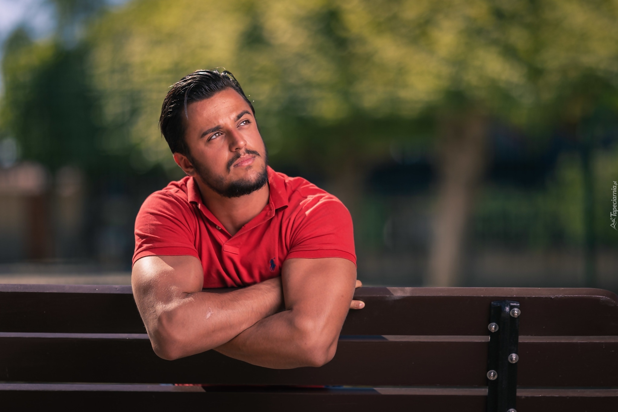 Edytor tapety: Zamyślony mężczyzna w czerwonej koszulce