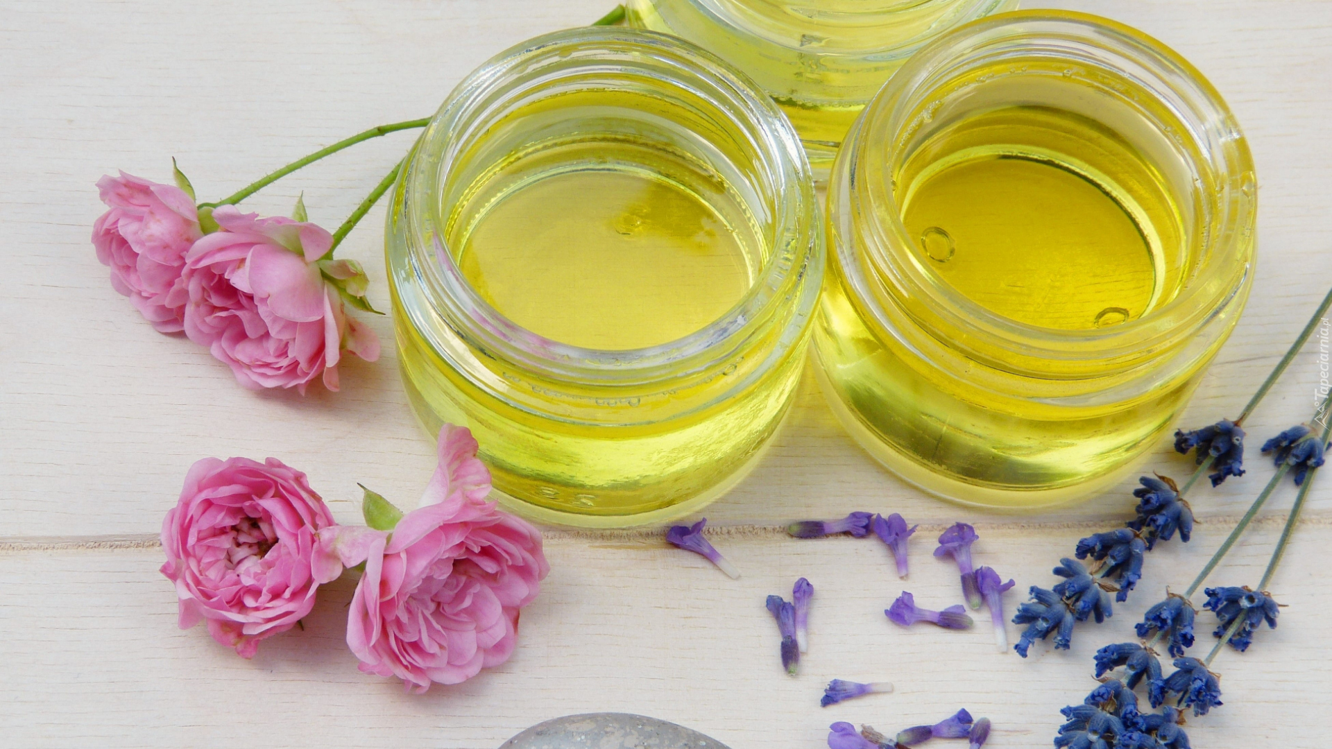 Edytor tapety: Słoiczki z olejkiem eterycznym obok róż i lawendy