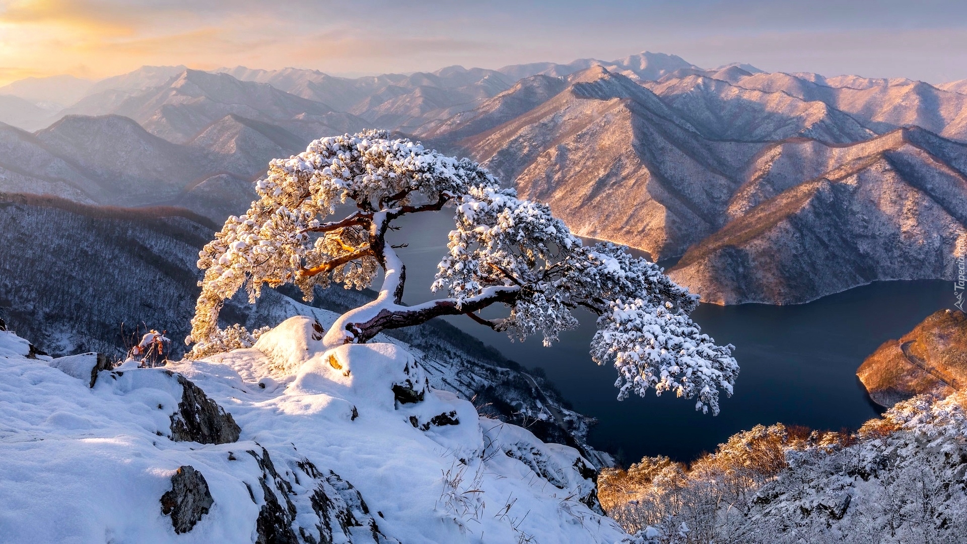 Edytor tapety: Ośnieżona sosna na tle gór