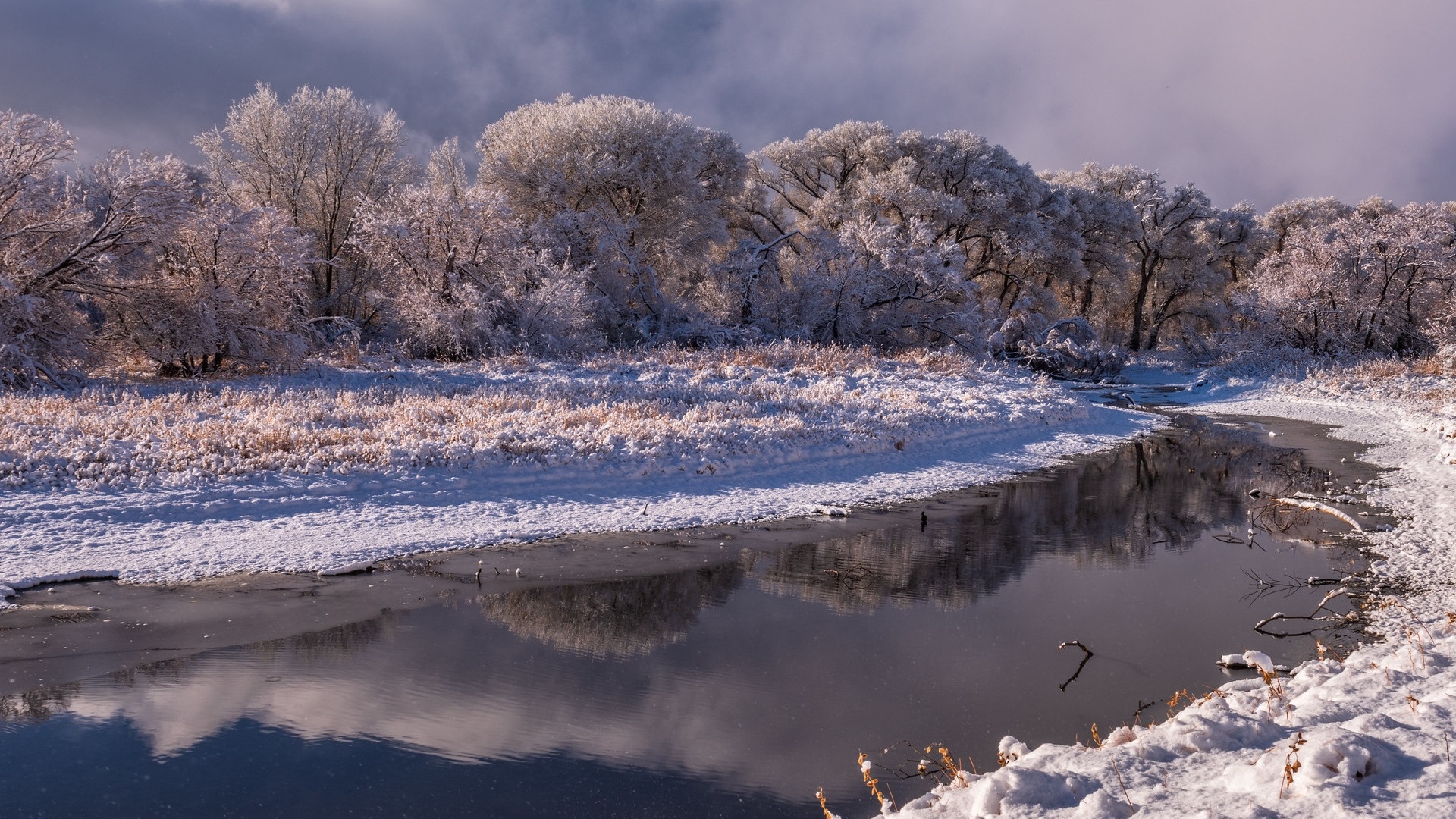 Edytor tapety: Oszronione drzewa i krzewy nad rzeką w słońcu