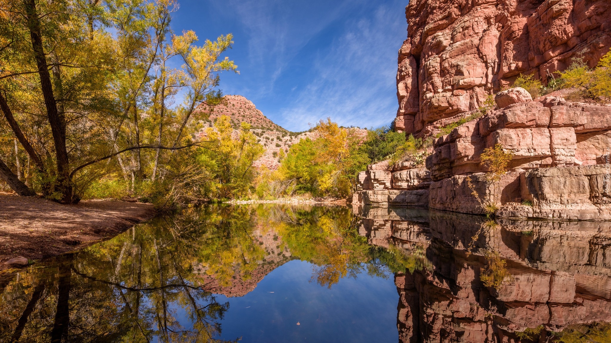 Edytor tapety: Odbicie rozświetlonych skał i drzew w jeziorze
