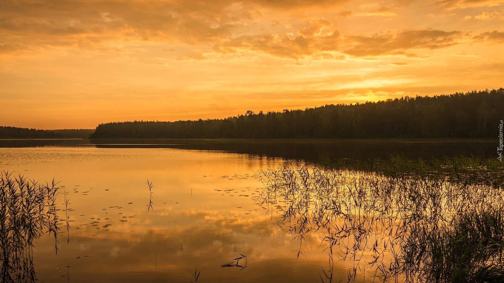 Edytor tapety: Szuwary i las nad jeziorem o zachodzie słońca