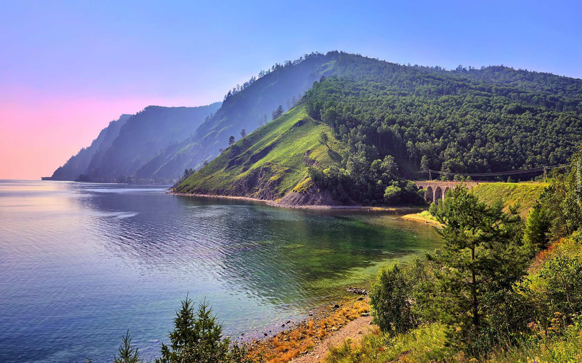 Edytor tapety: Zalesione góry i wiadukt kolejowy nad jeziorem
