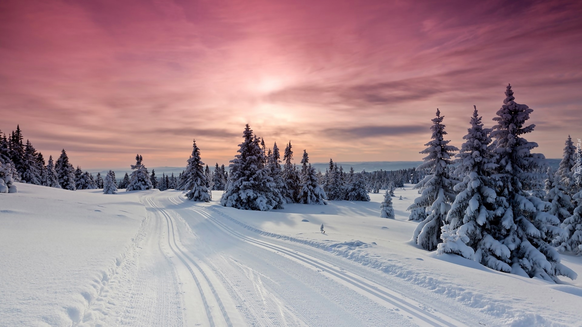 Edytor tapety: Zaśnieżona droga i drzewa w blasku zachodzącego słońca