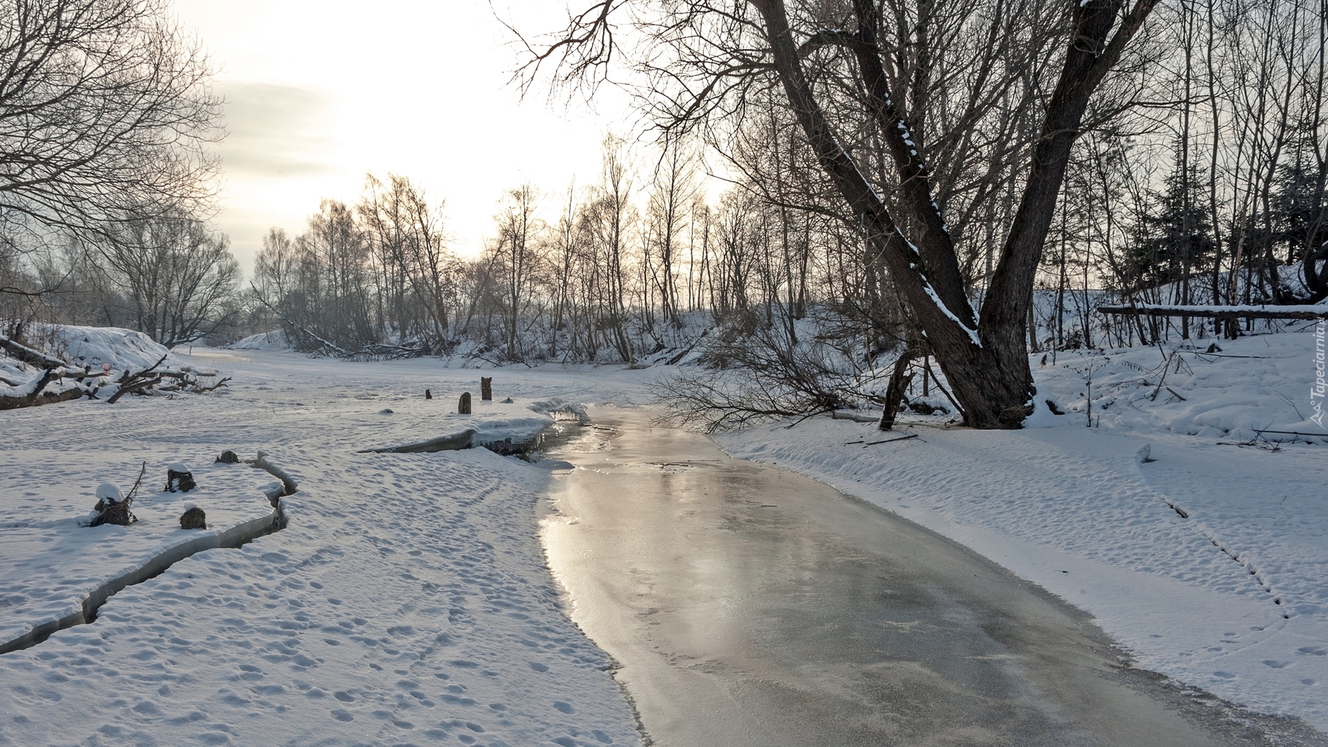 Edytor tapety: Drzewa w śniegu nad zamarzniętą rzeką