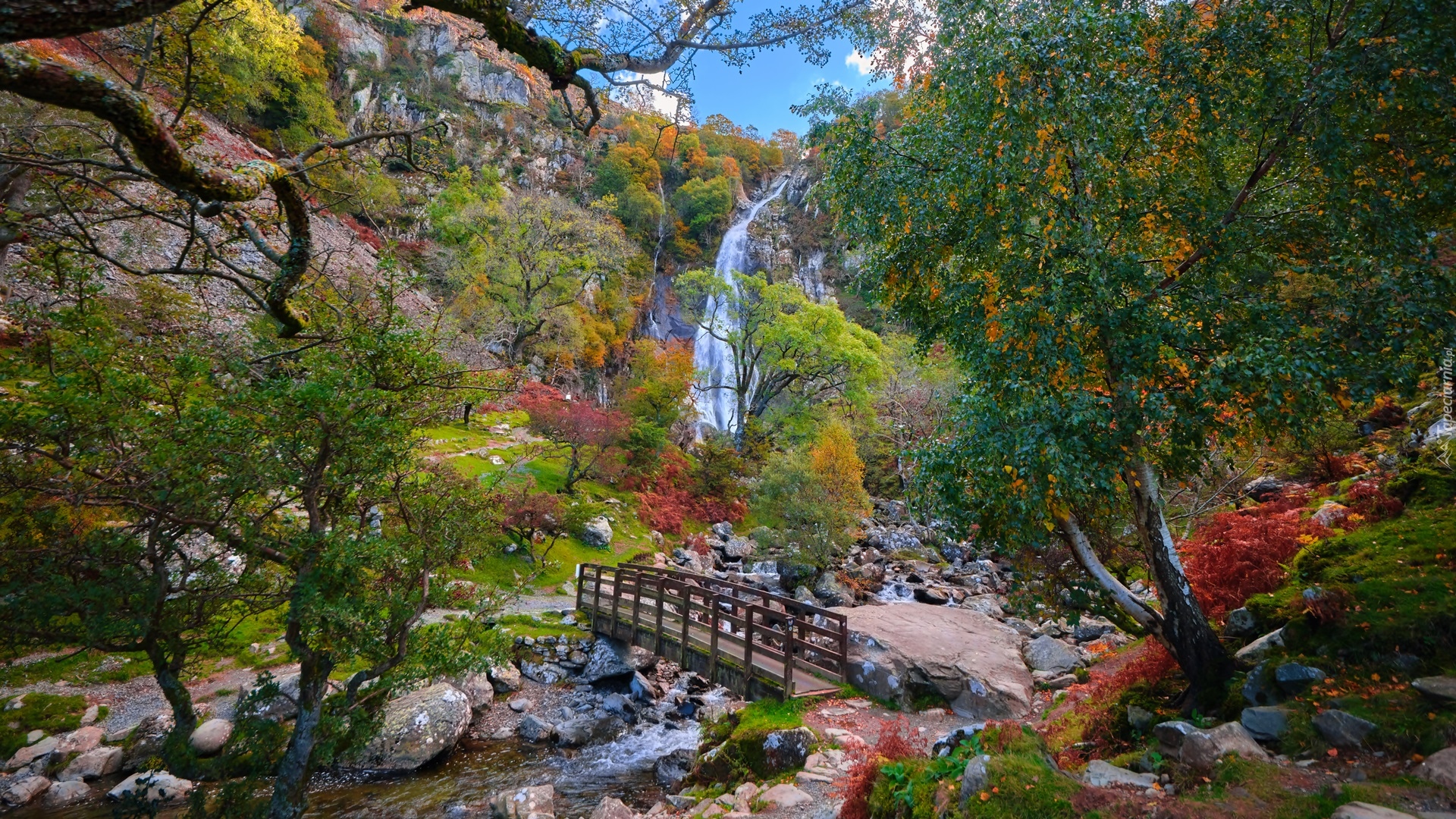 Edytor tapety: Mostek na kamienistym potoku obok wodospadu w górach