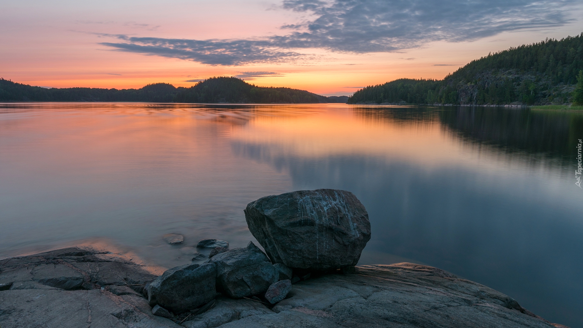 Edytor tapety: Kamienie na skałach nad jeziorem