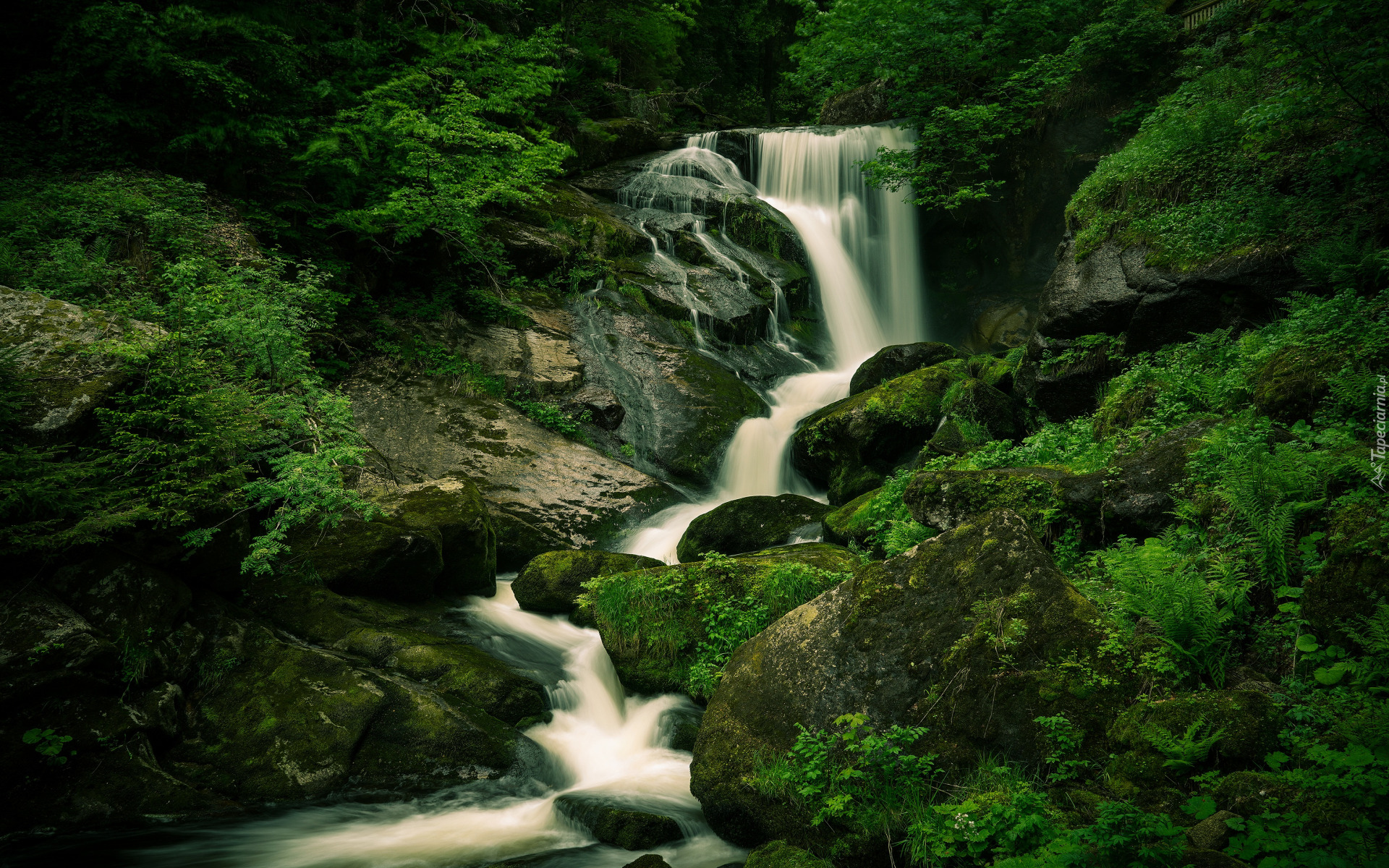 Edytor tapety: Omszałe skały i zielone drzewa przy wodospadzie