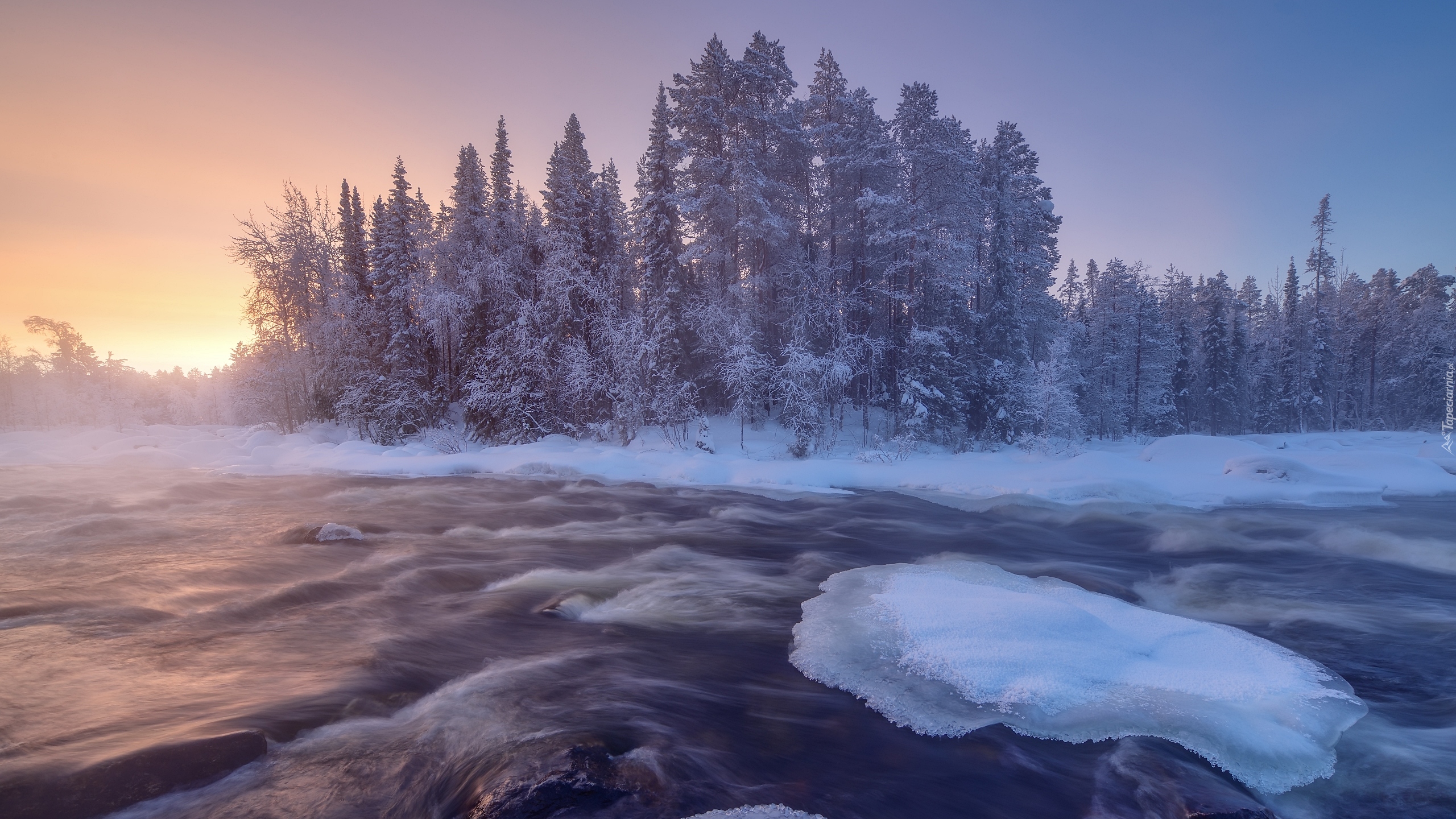 Edytor tapety: Ośnieżone drzewa nad rzeką Kolvitsa