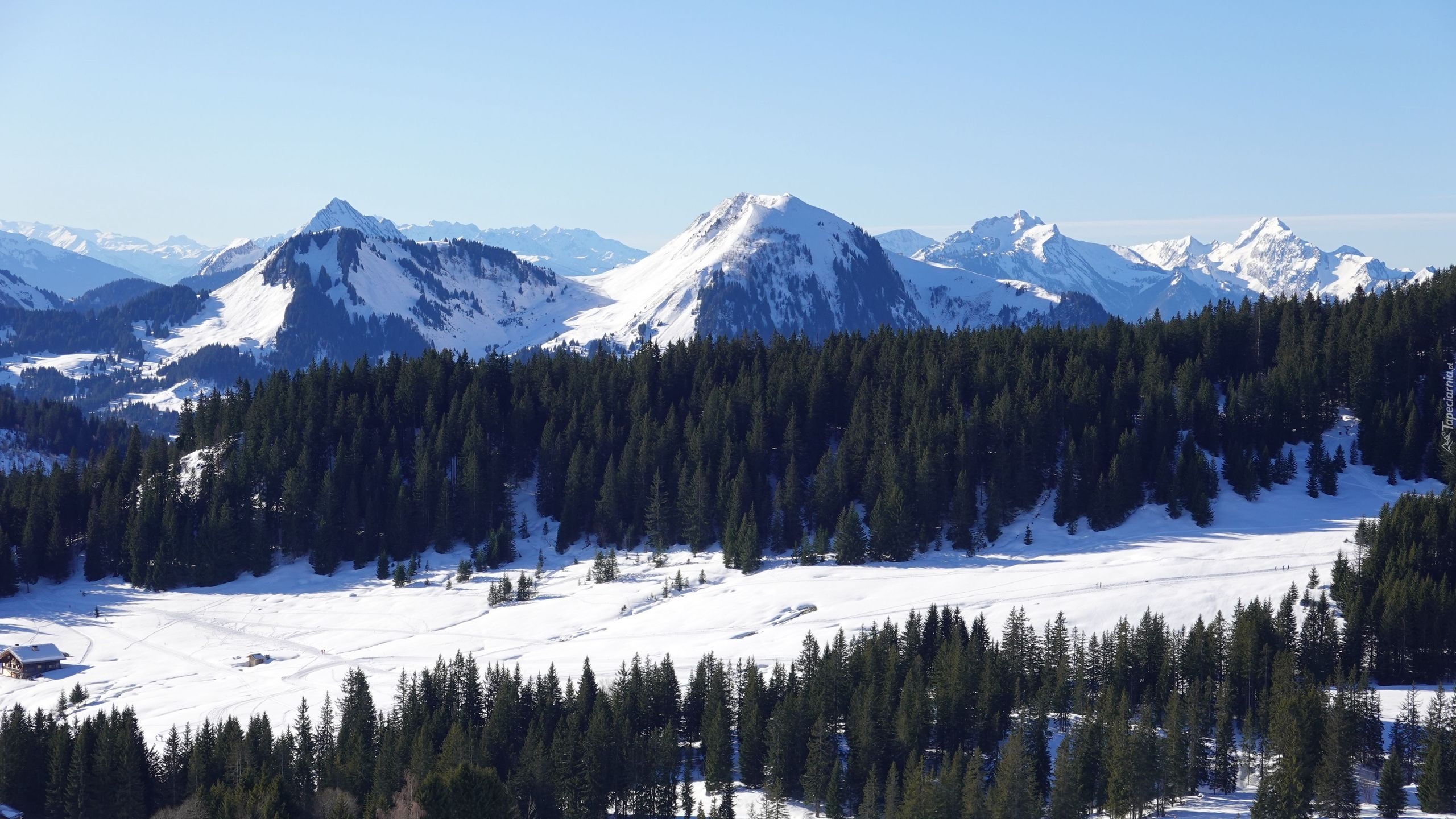 Edytor tapety: Ośnieżone góry za drzewami