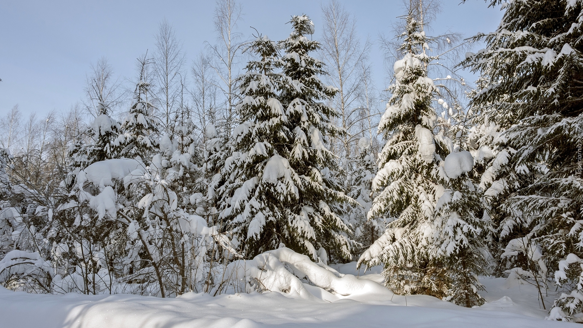 Edytor tapety: Rozświetlone słońcem ośnieżone drzewa w lesie