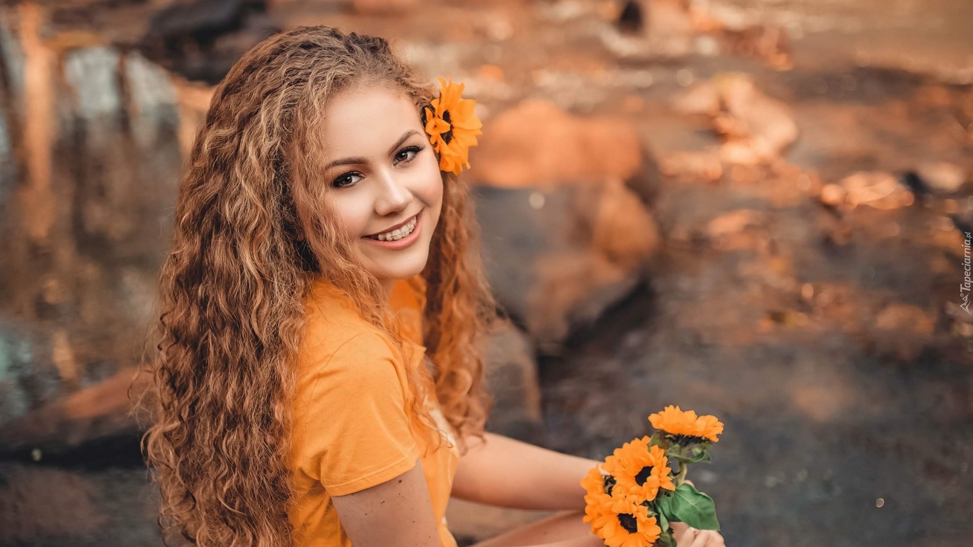 Edytor tapety: Uśmiechnięta dziewczyna z kwiatami