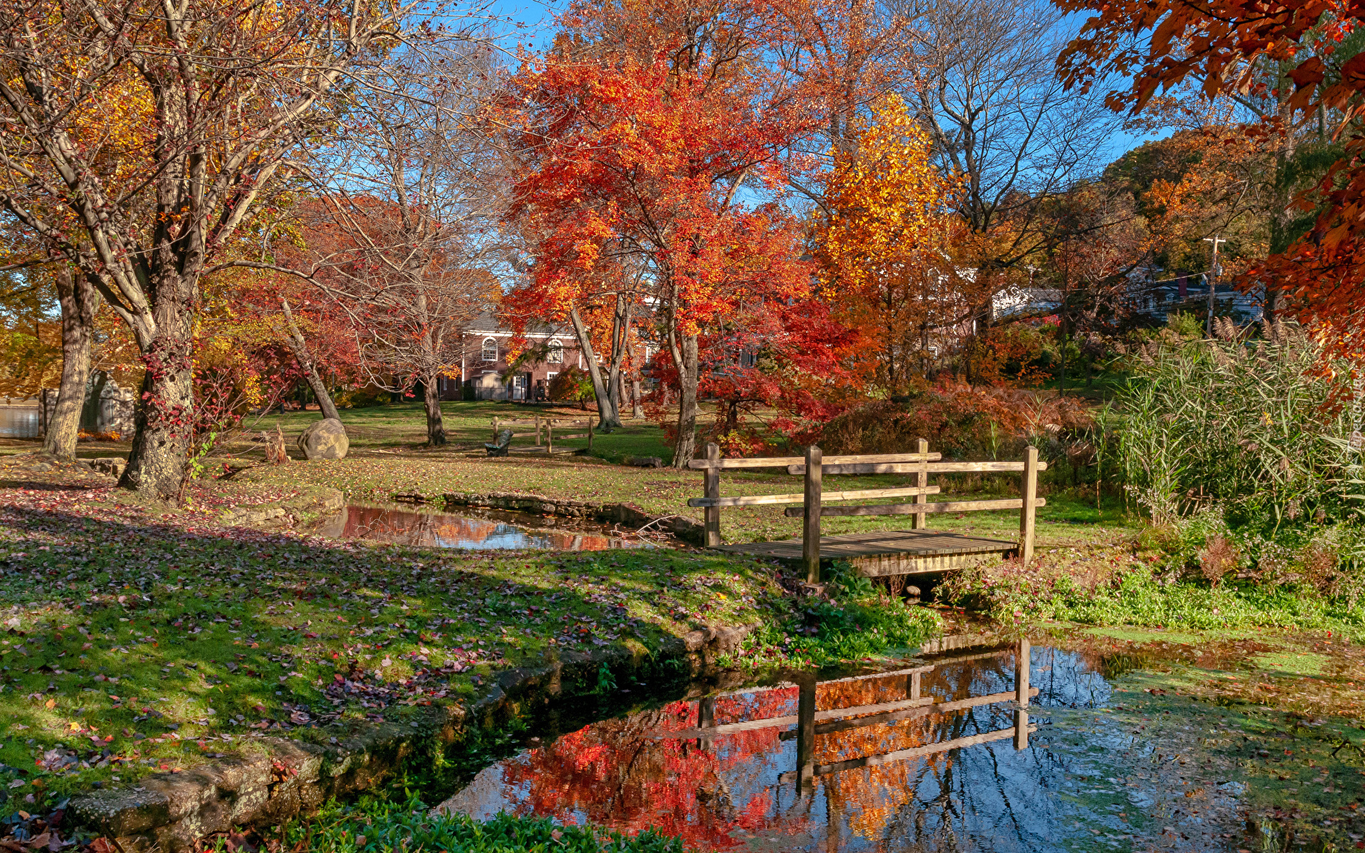 Edytor tapety: Jesienne drzewa obok mostku nad stawem w parku