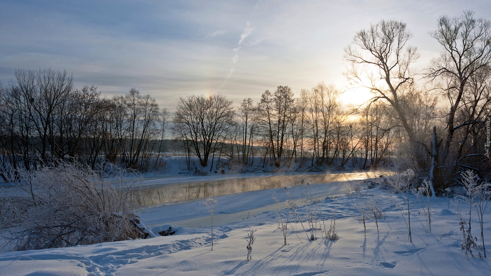 Edytor tapety: Drzewa i rośliny w śniegu na brzegach rzeki