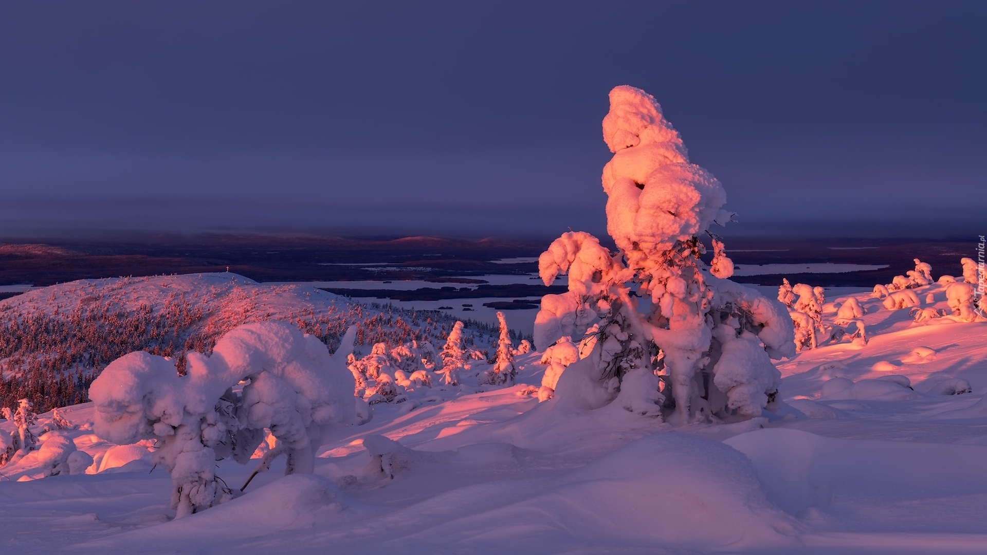 Edytor tapety: Ośnieżone drzewa na wzgórzu w blasku zachodzącego słońca