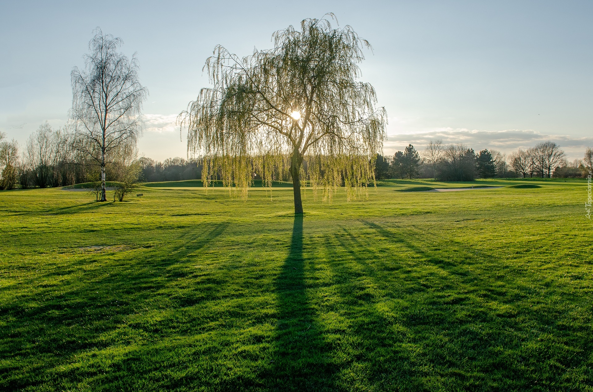 Edytor tapety: Drzewa w promieniach słońca na zielonej łące