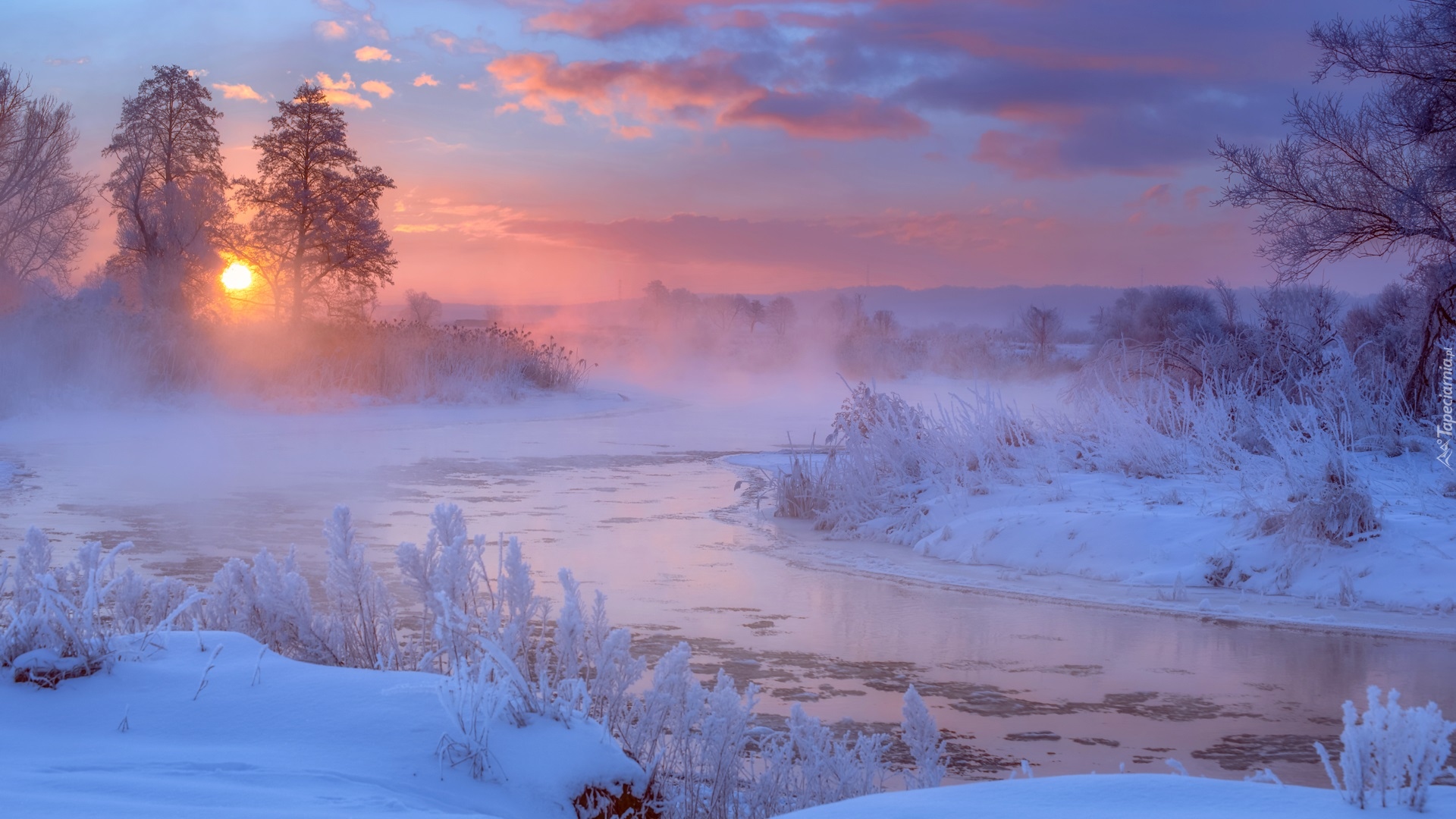 Edytor tapety: Mgła nad rzeką Gwdą i ośnieżone drzewa