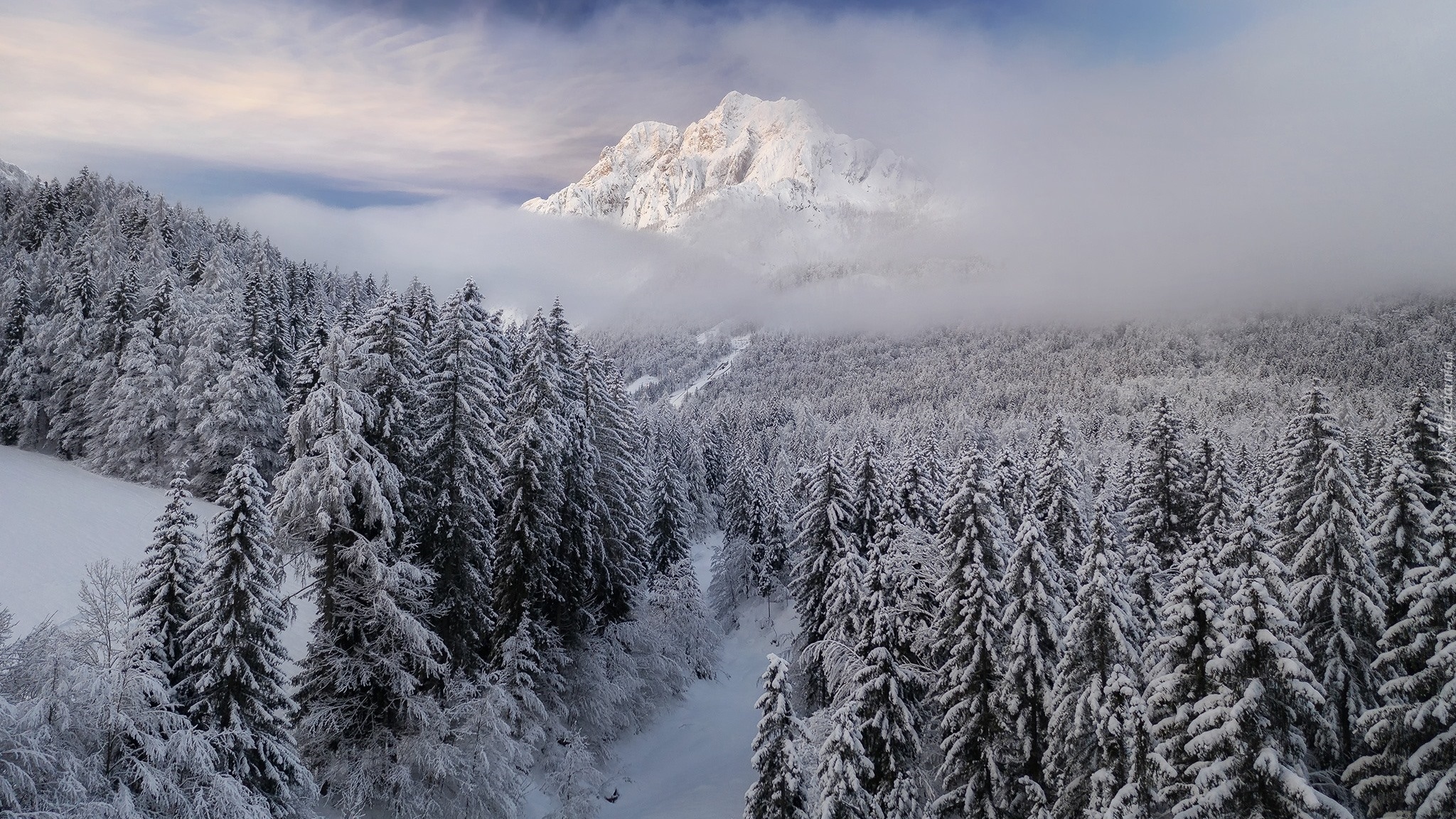 Edytor tapety: Zaśnieżony górski krajobraz w gęstej mgle