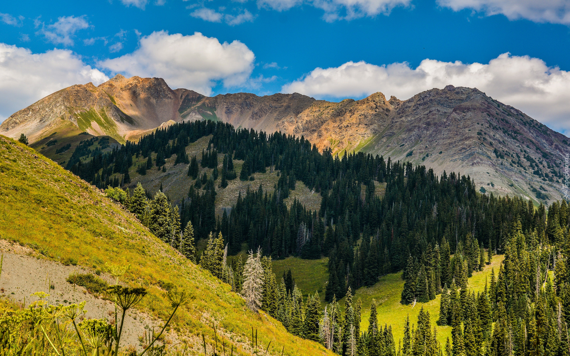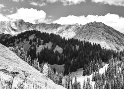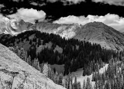 Edytor tapety: Górzysty krajobraz z zalesionymi wzgórzami