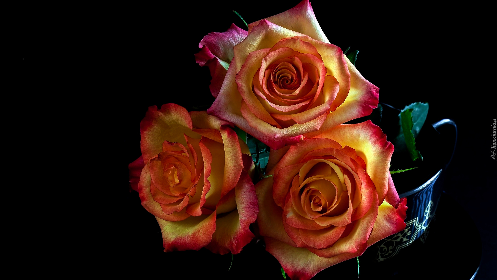 Edytor tapety: Trzy rozkwitnięte róże na czarnym tle