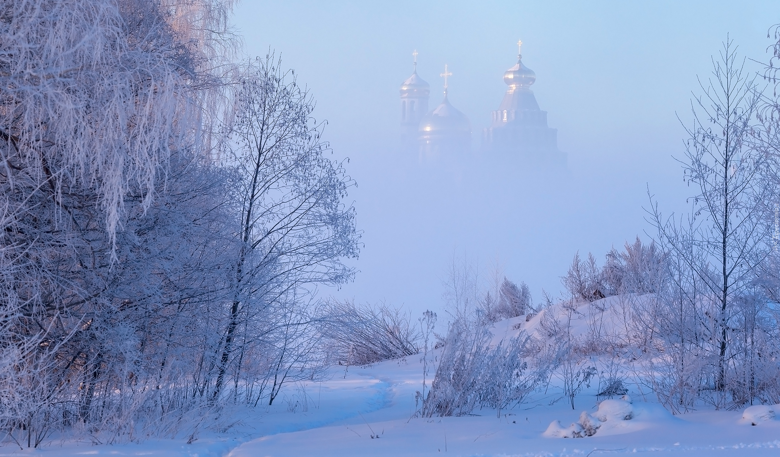 Edytor tapety: Widok na ośnieżone drzewa i cerkiew we mgle