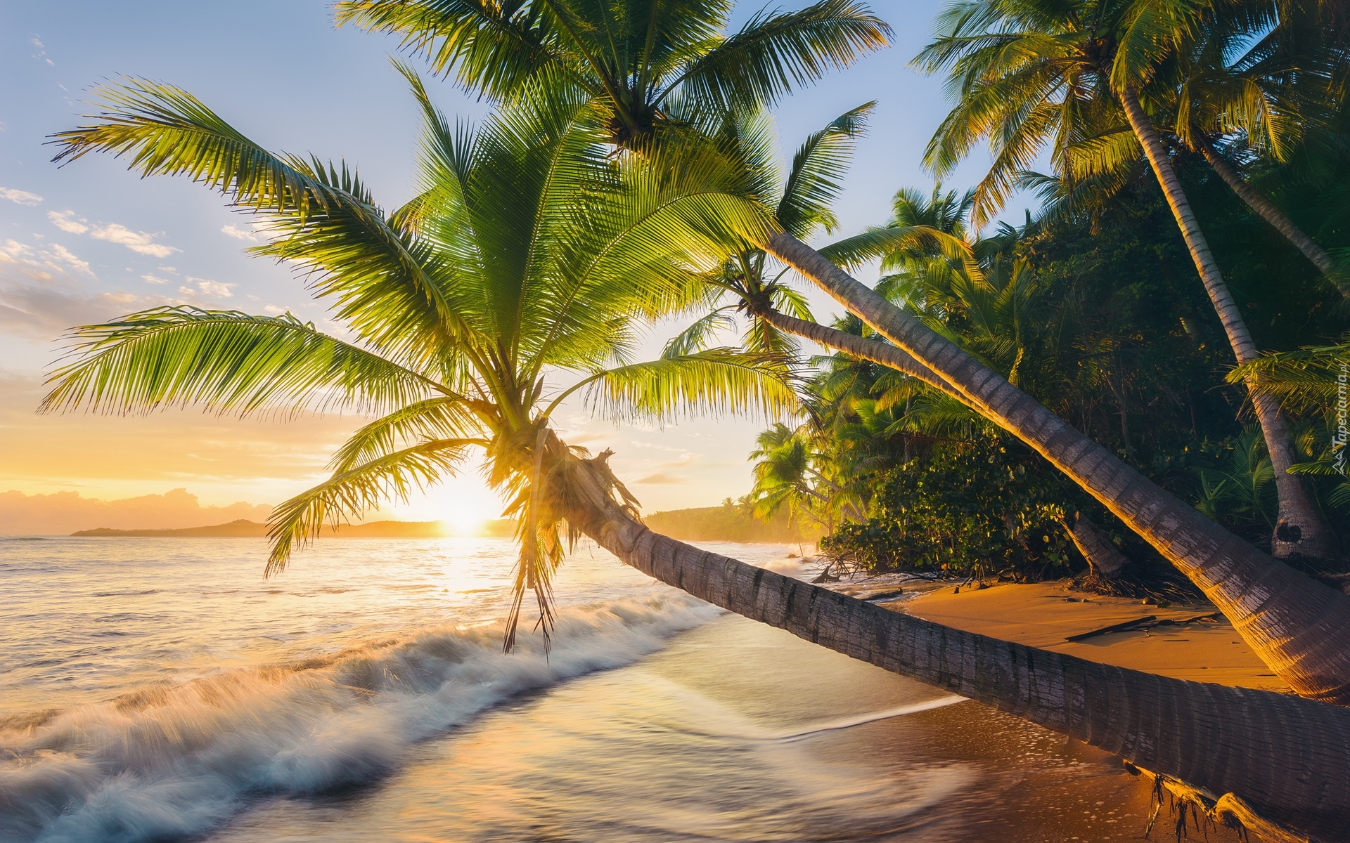 Edytor tapety: Pochylone palmy nad falami nad brzegiem morza
