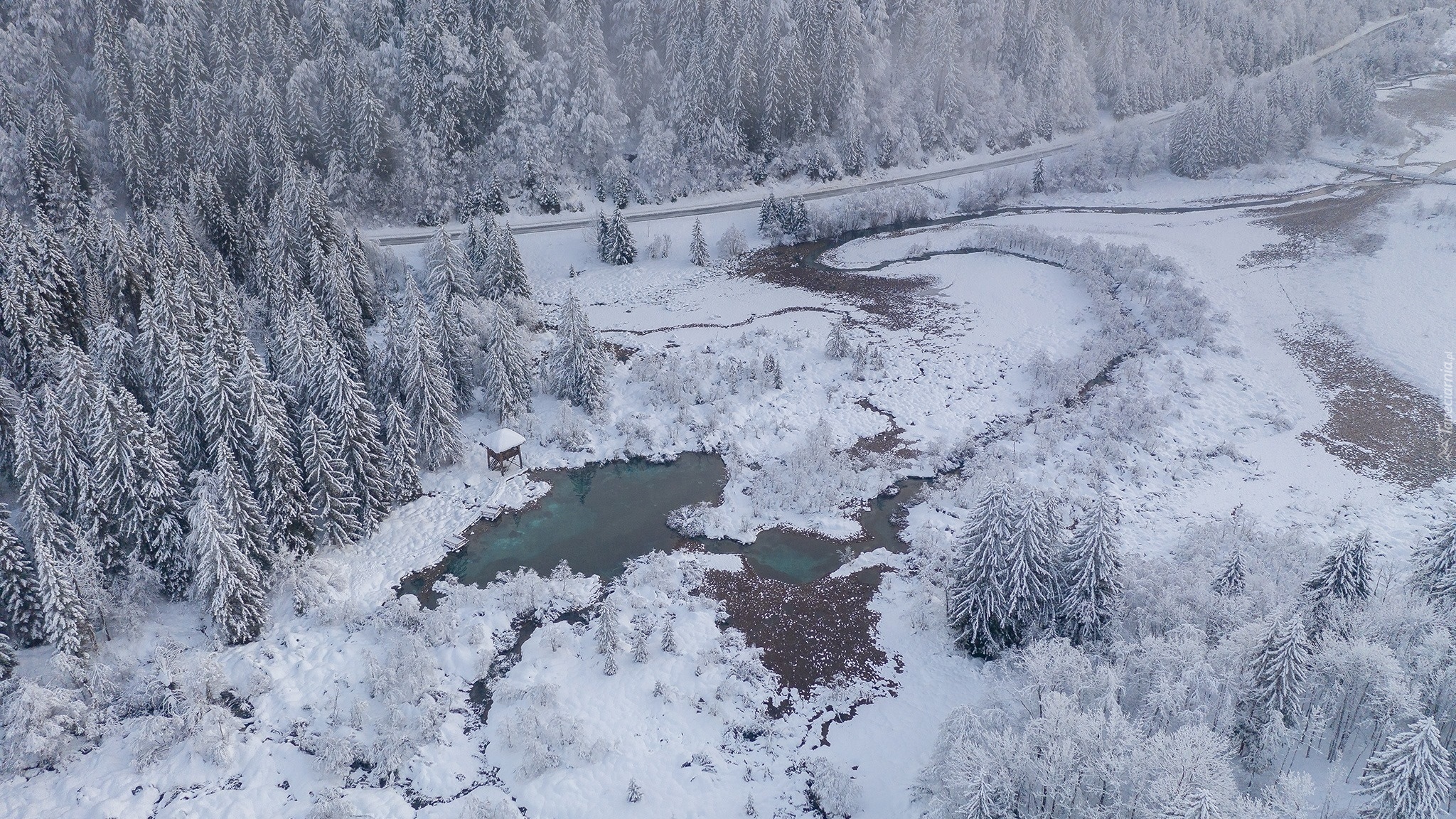 Edytor tapety: Zaśnieżony las i rzeka z lotu ptaka