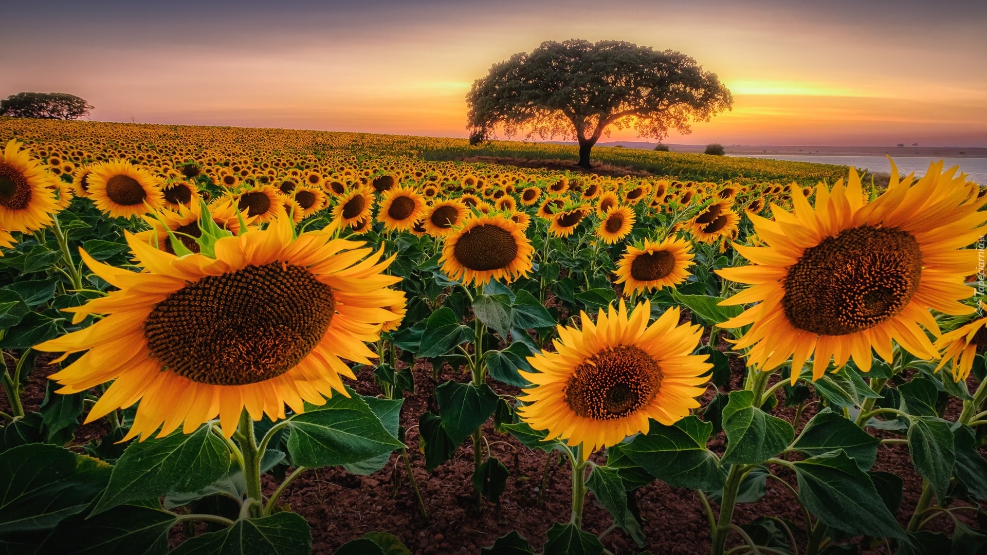 Edytor tapety: Słoneczniki w zbliżeniu i drzewo w oddali