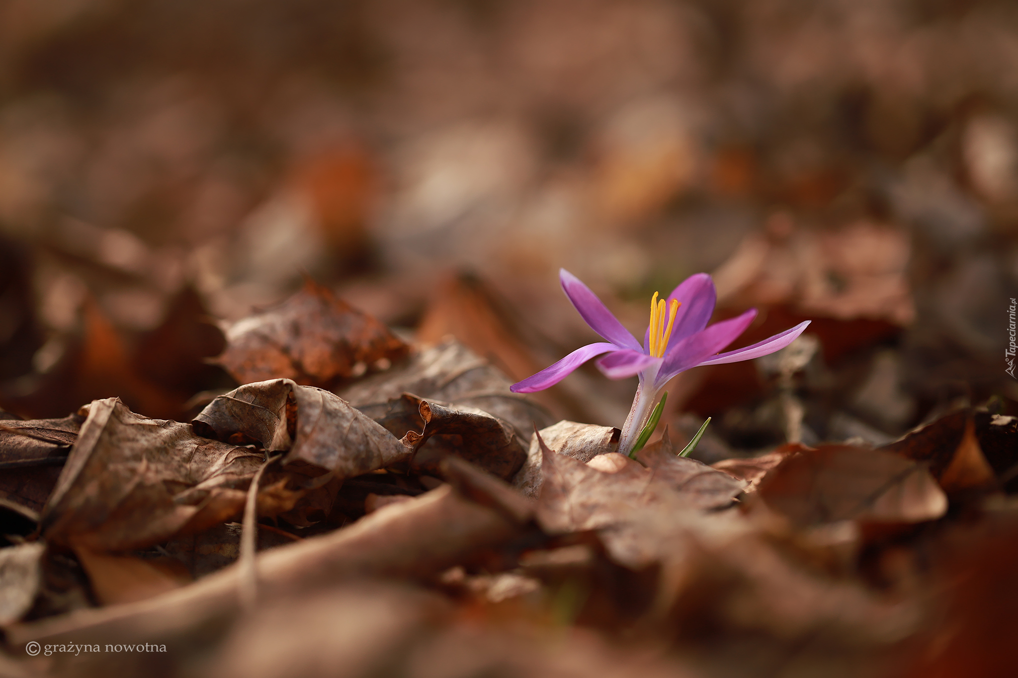 Edytor tapety: Rozwinięty fioletowy krokus w suchych liściach