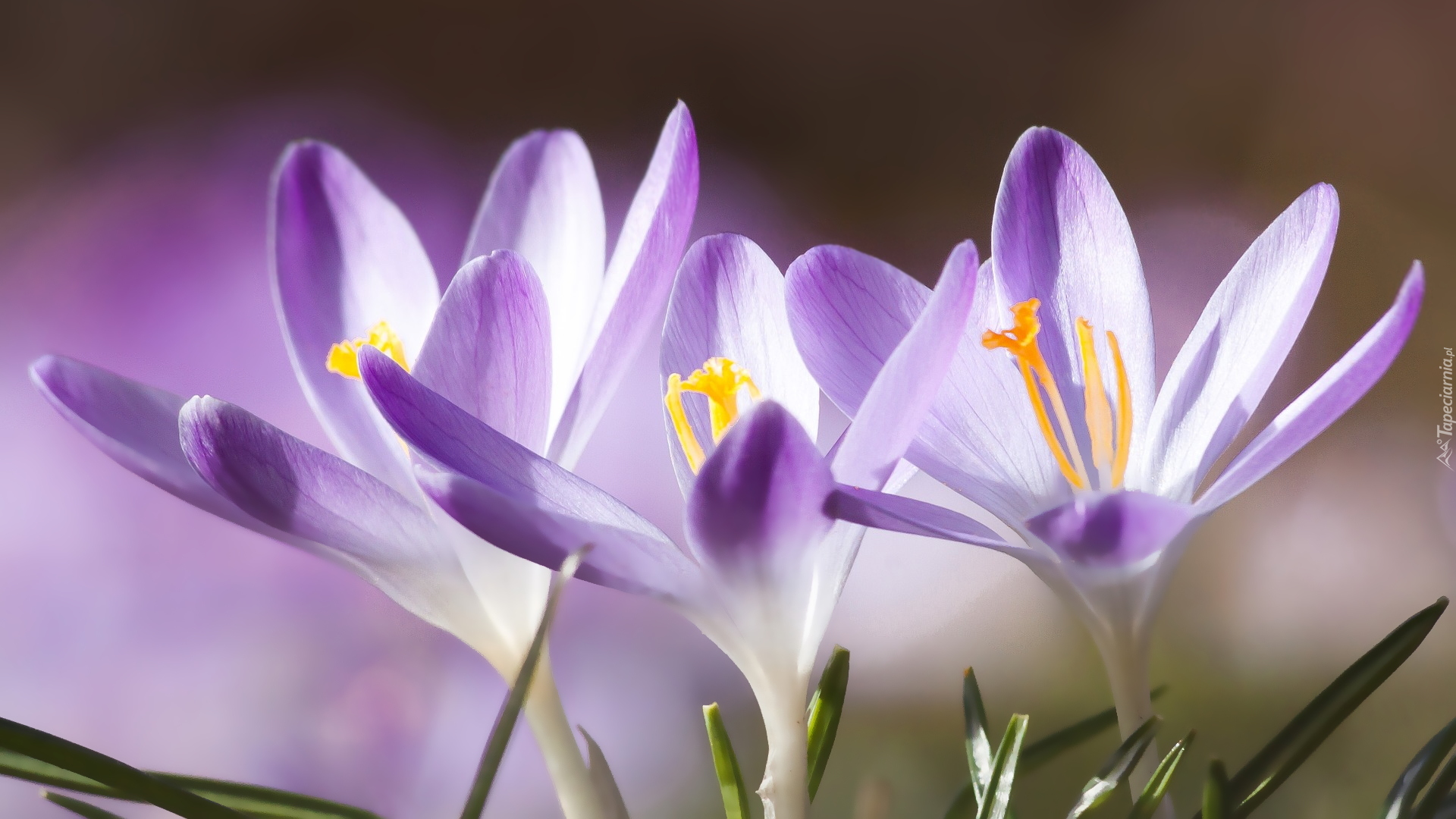 Edytor tapety: Trzy rozkwitnięte krokusy z pręcikami