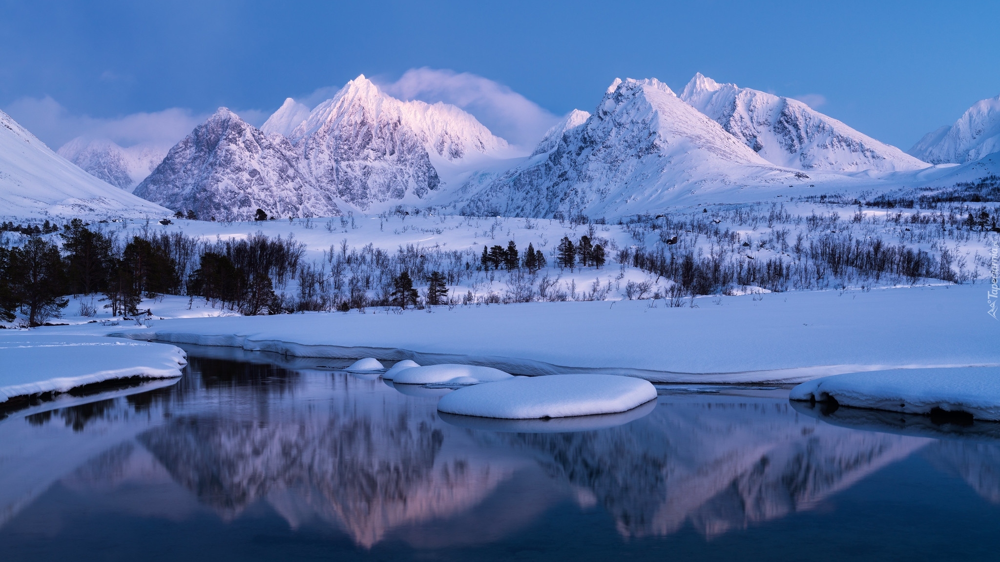 Edytor tapety: Zaśnieżona rzeka Stortindelva w norweskich Górach Śnieżnych