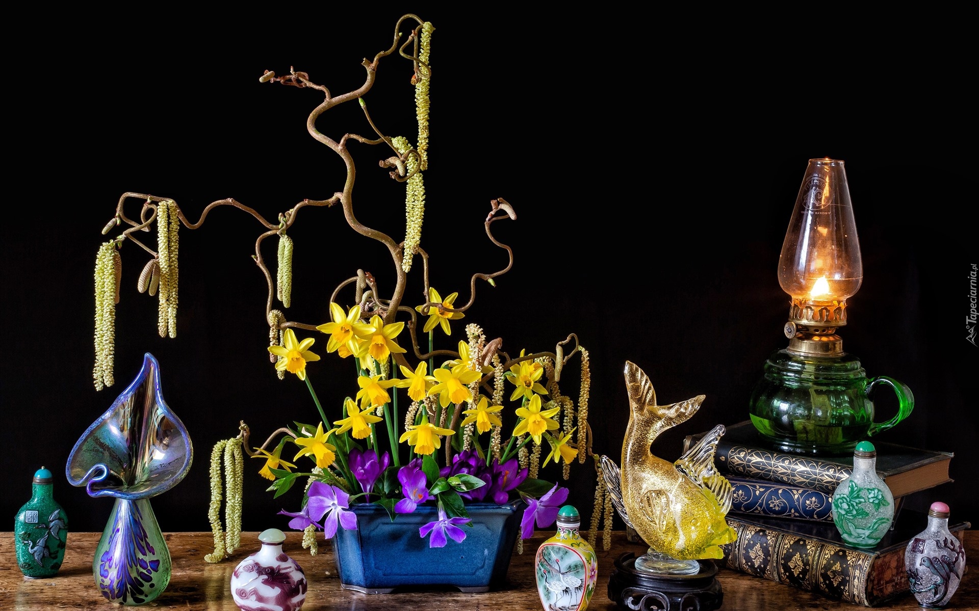 Edytor tapety: Narcyzy żonkile i gałązki leszczyny obok lampy