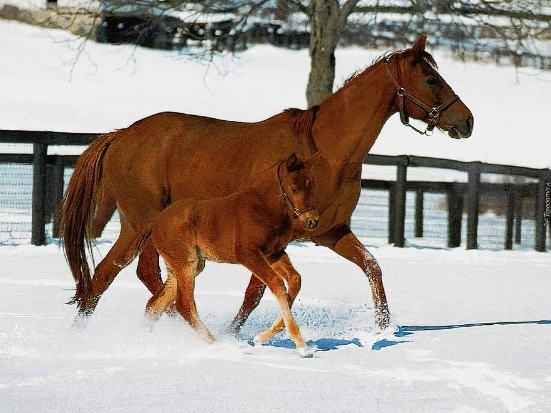 Edytor tapety: Koń, źrebię, śnieg, padok