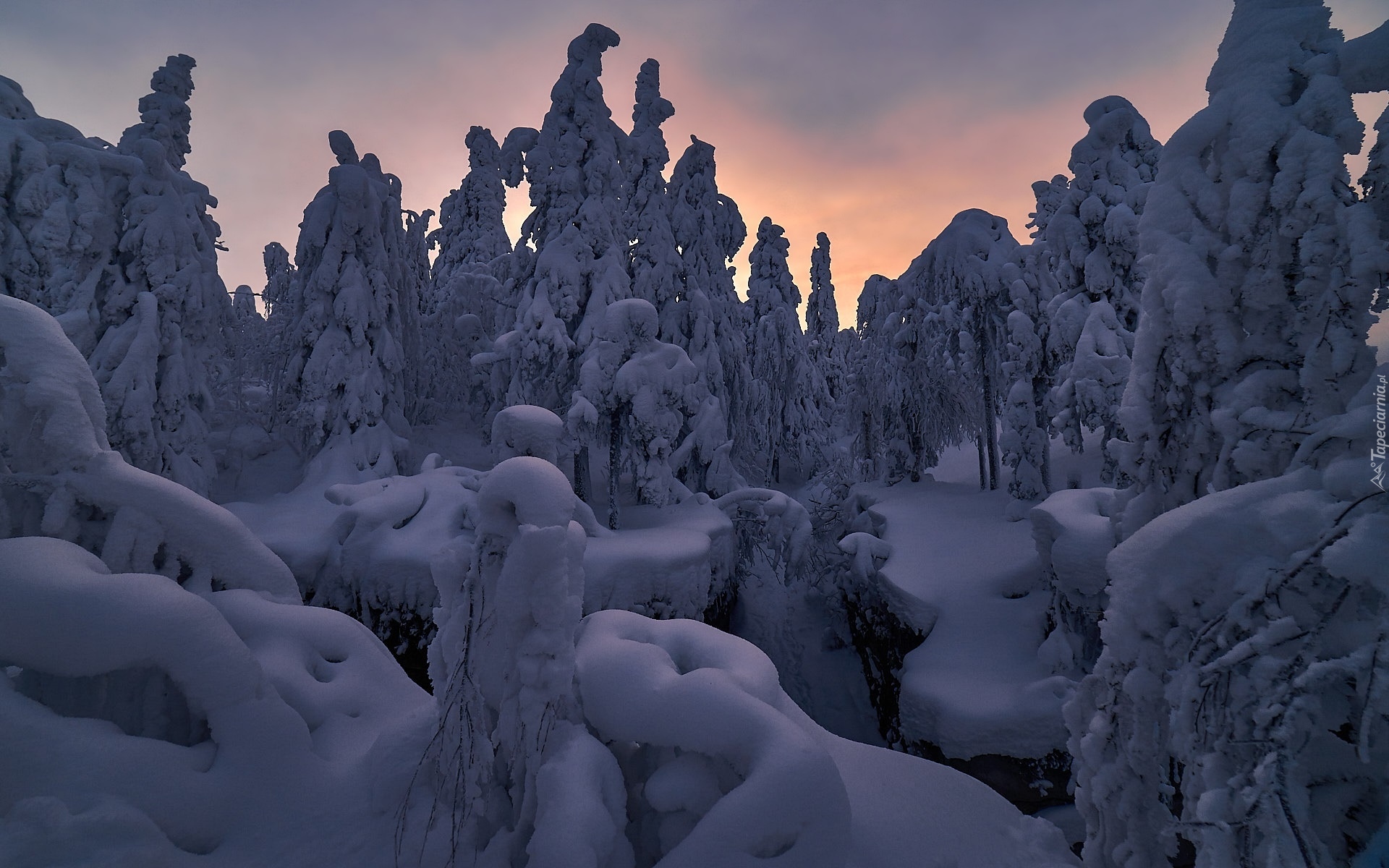 Edytor tapety: Zasypane śniegiem drzewa o poranku