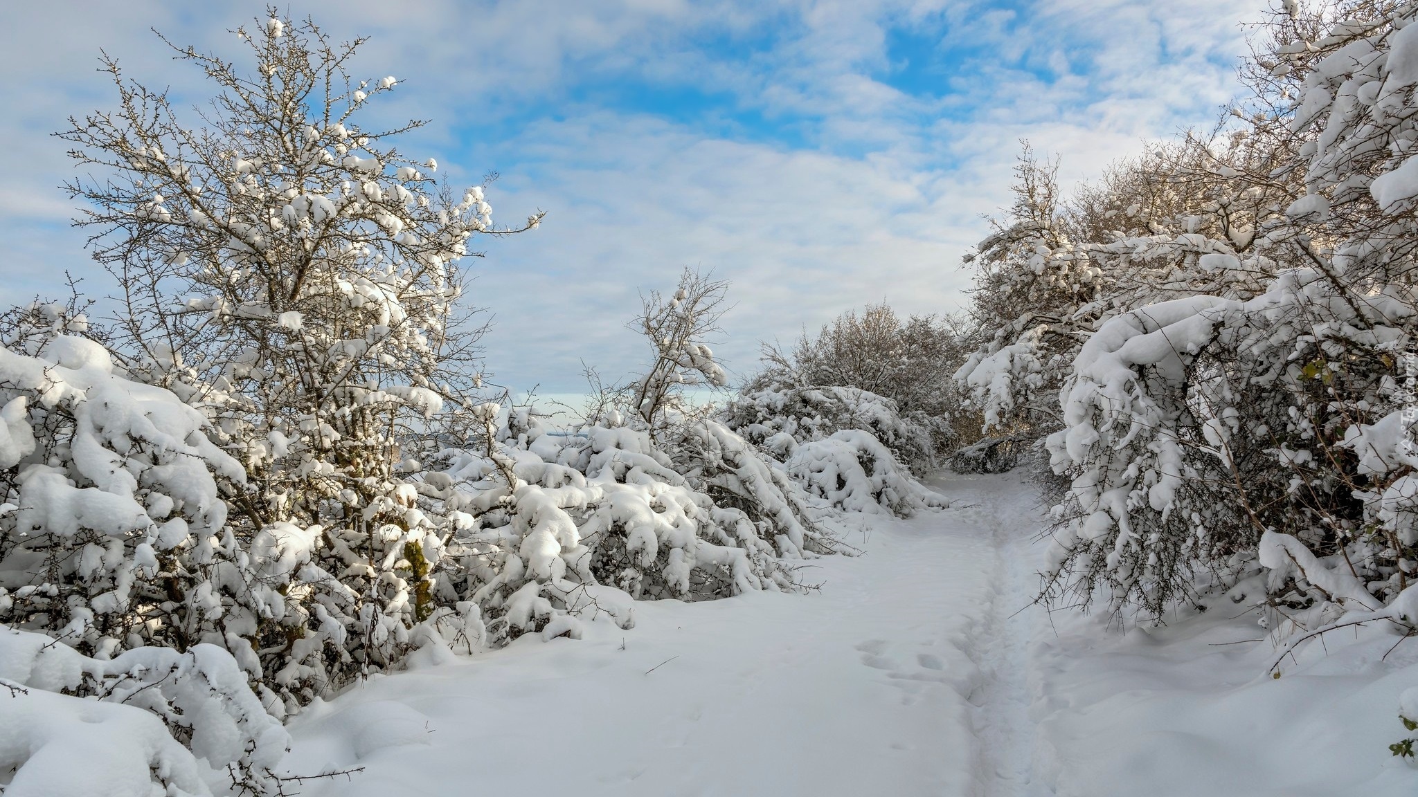 Edytor tapety: Ślady na śniegu pod ośnieżonymi drzewami i krzewami