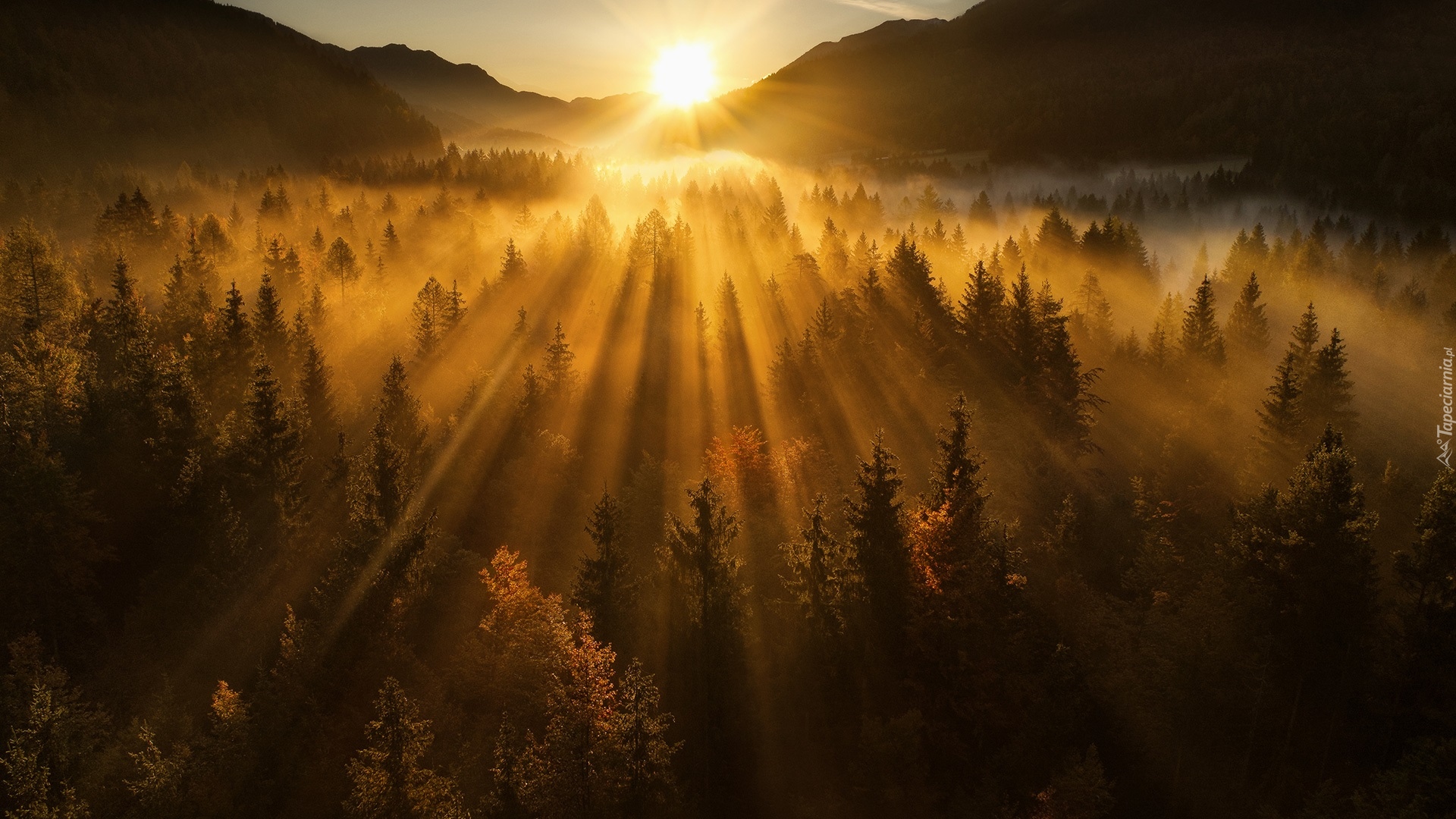 Edytor tapety: Słońce oświetlające zamglony las