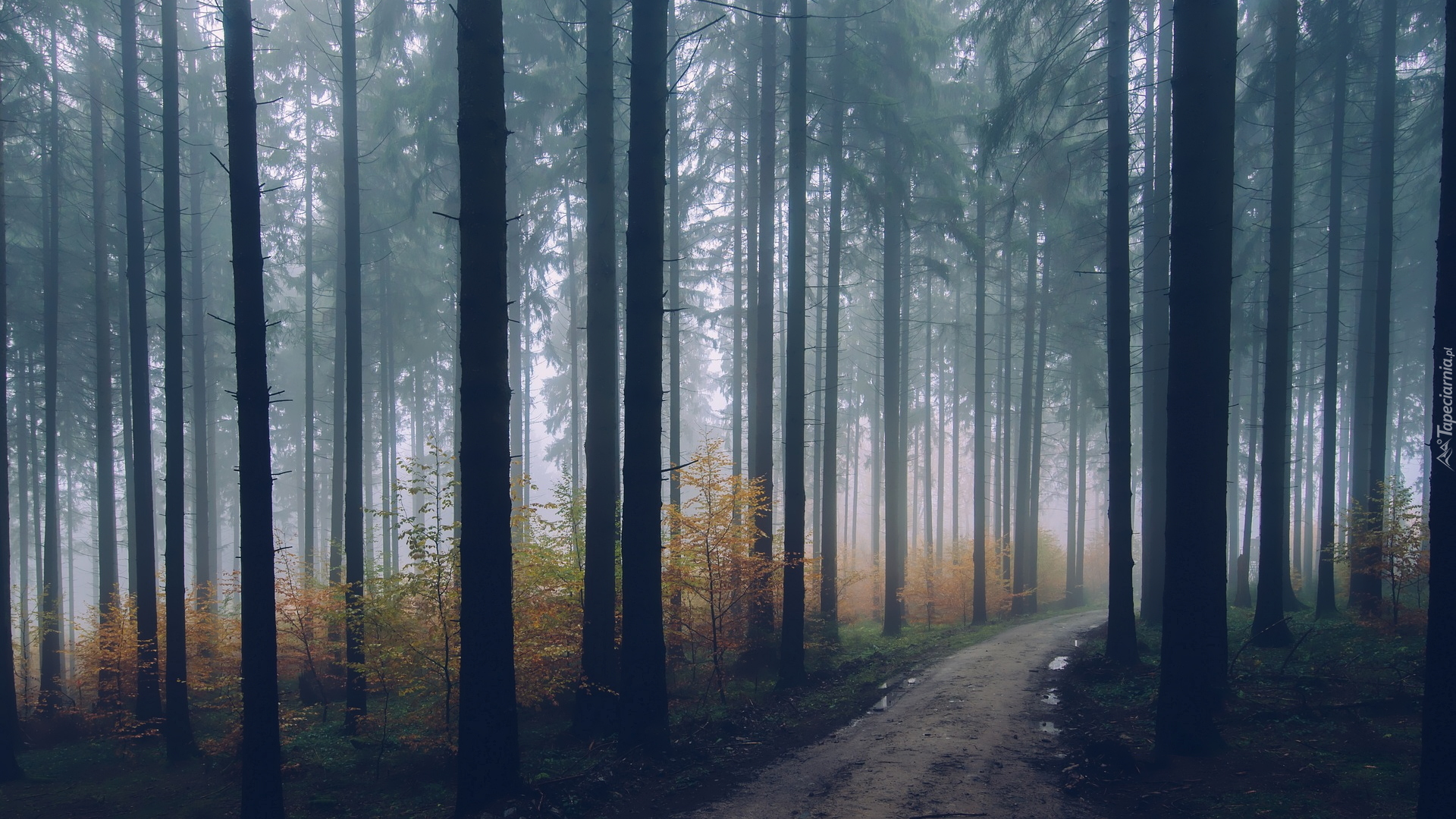 Edytor tapety: Droga pośród wysokich drzew w zamglonym lesie