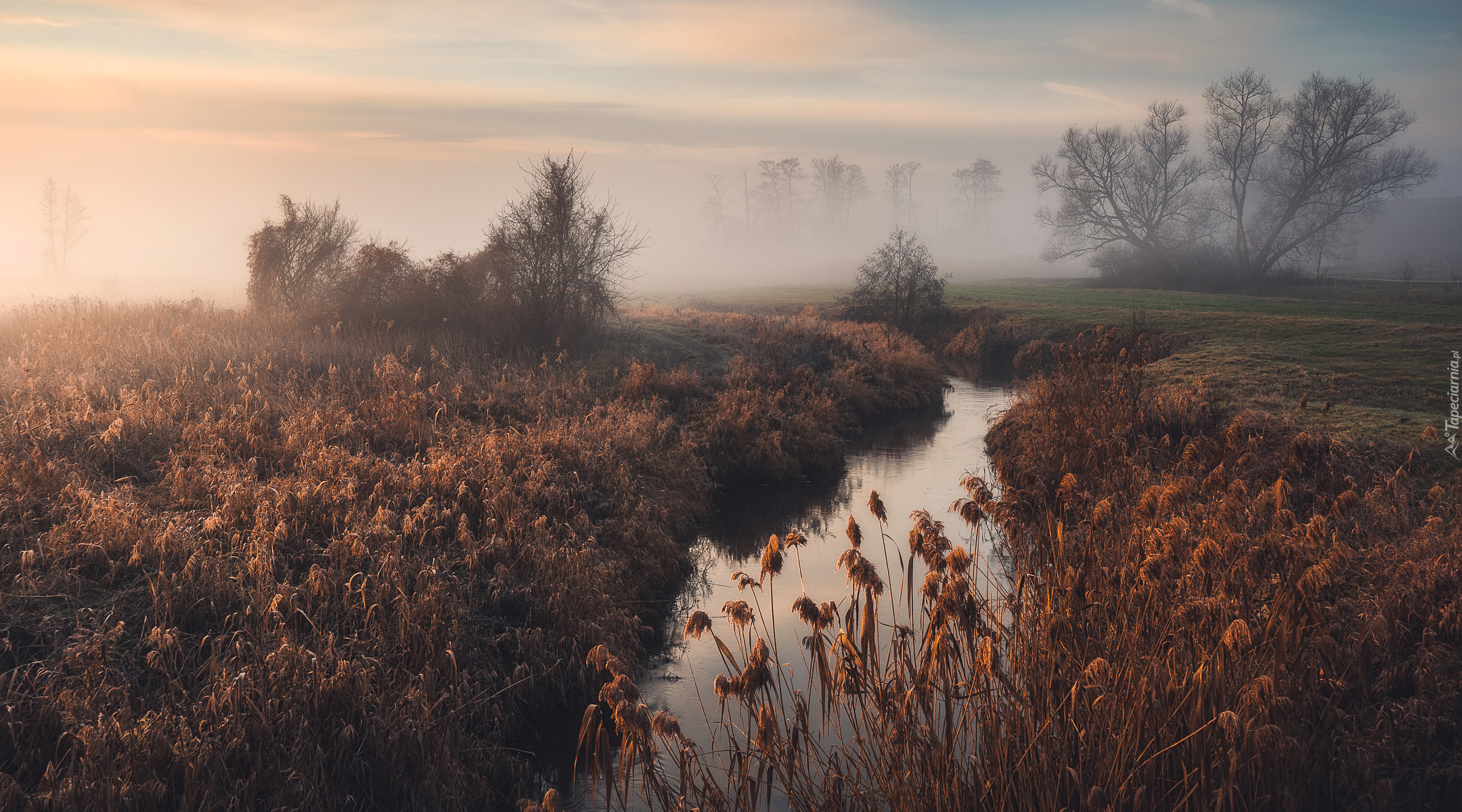 Edytor tapety: Pożółkłe rośliny nad rzeką na zamglonych polach
