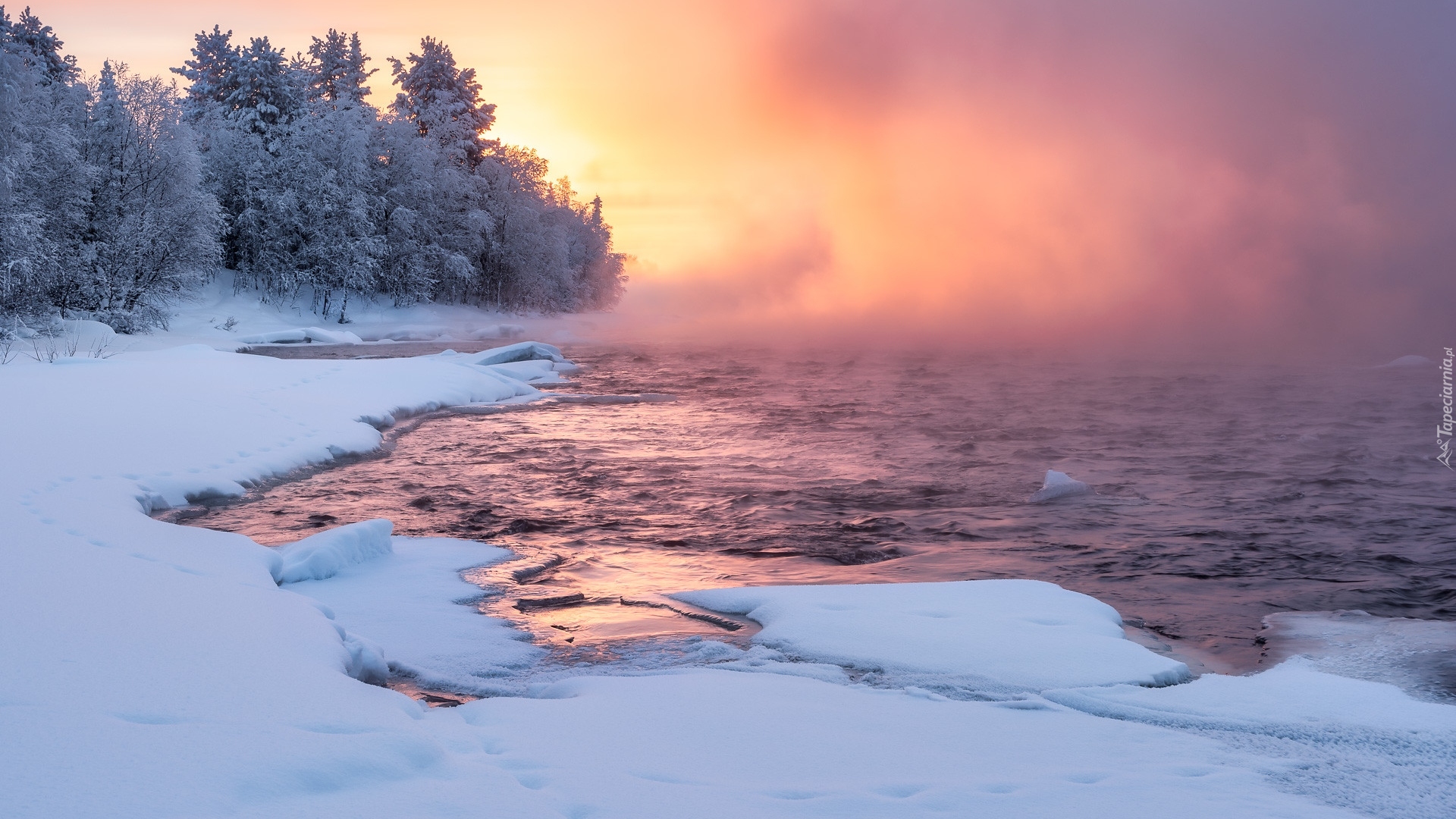 Edytor tapety: Mglisty poranek nad rzeką zimową porą
